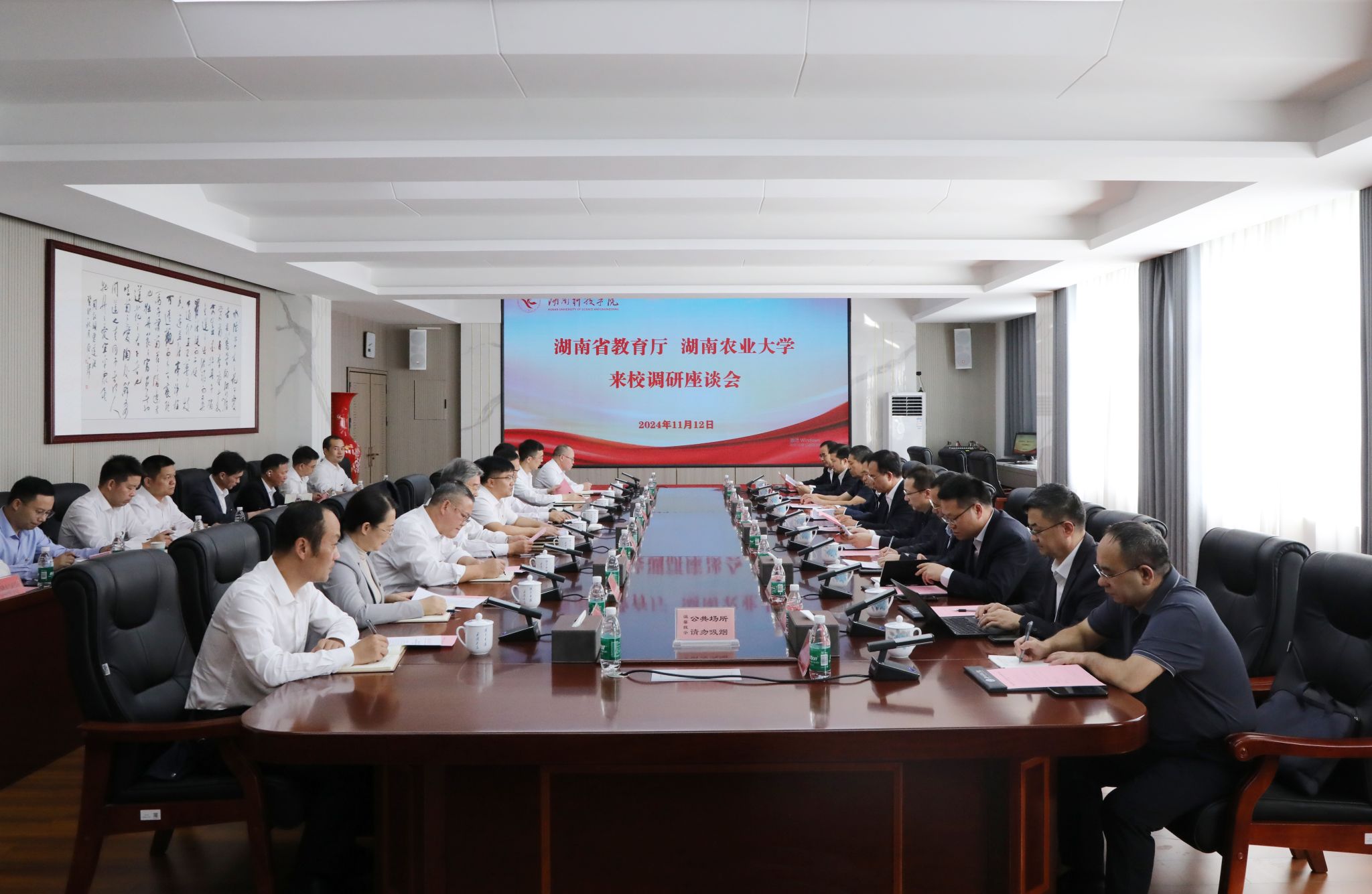 本网讯(记者 孙淑娴 赵丹 摄影 谢志豪)11月12日,湖南省教育厅党组成员、副厅长兰勇,湖南农业大学党委书记陈弘,中国工程院院士、湖南农业大学校长邹学校,湖南农业大学党委委员、副校长谢方平,湖南省教育厅高等教育处处长张平一行来bat365官网考察调研,并进行座谈交流。bat365官网党委书记李钢,党委副书记、校长黄创霞,校领导宋宏福、吴小林、何福林、陈灿军、郑银芳、何海,党委委员、组织部部长杨涛等陪同调研。座谈会由李钢主持。
