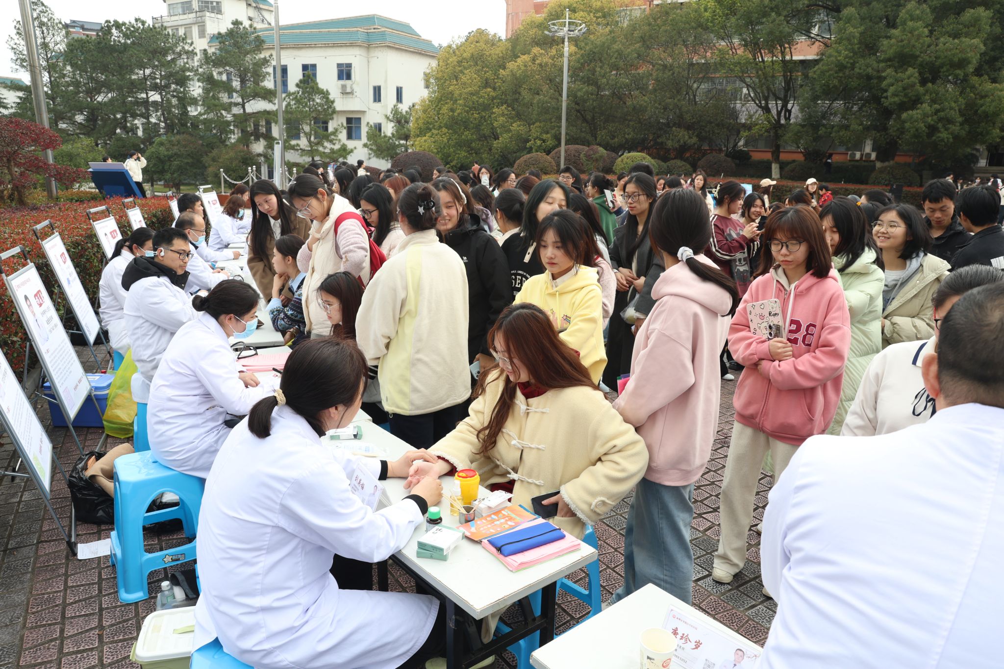 活动主要包括健康咨询与筛查、主题海报展览、互动游戏与有奖问答等环节,在健康咨询台前,医疗团队为师生提供免费义诊和结核病筛查,为师生和周边社区群众普及结核病常见症状、传播途径、预防措施等知识,还向师生群众们赠送了手工制作的中药锤和足浴包。
