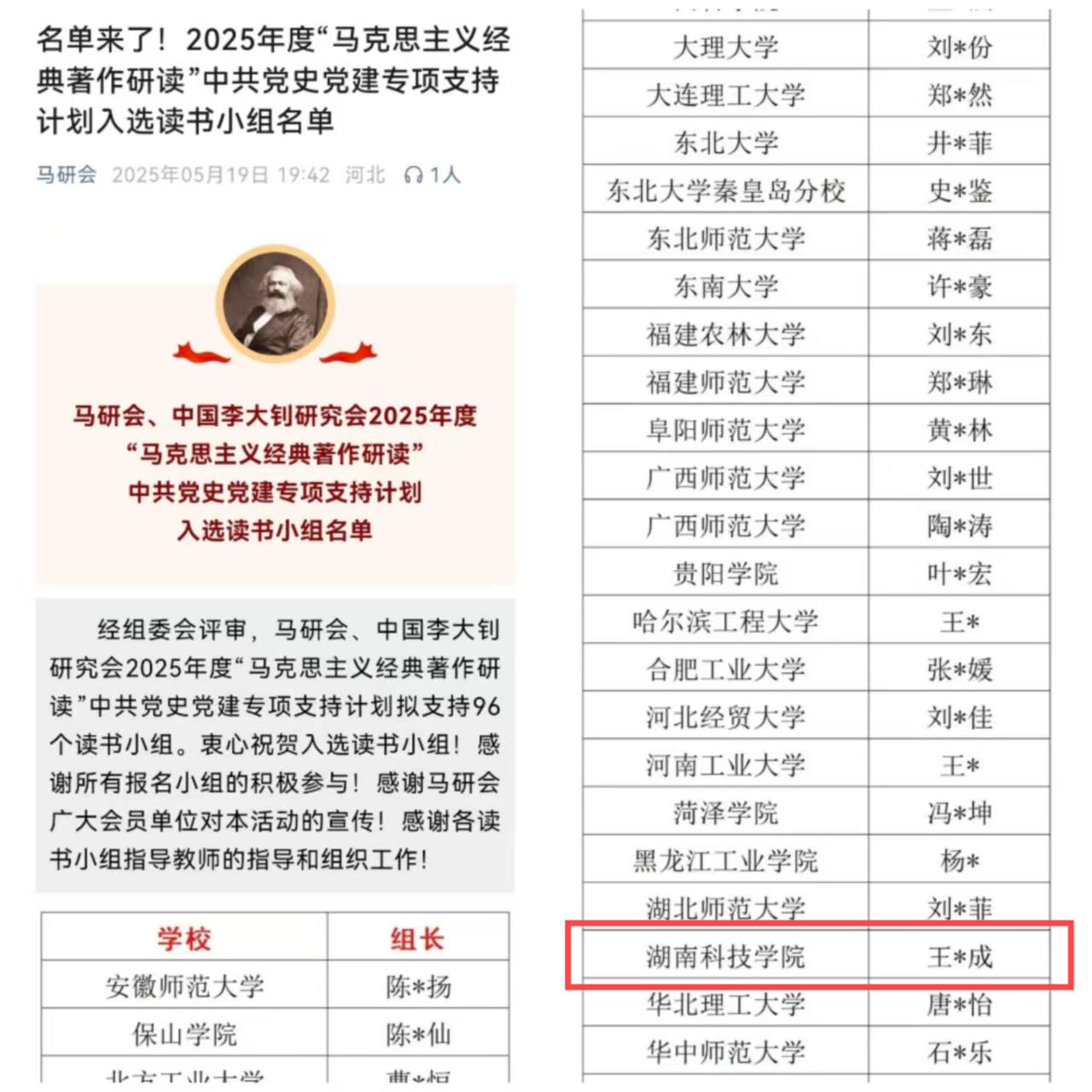 本网讯(通讯员 王志成 曹惠如)5月19日,中国高等教育学会马克思主义研究分会(以下简称“马研会”)、中国李大钊研究会2025年度“马克思主义经典著作研读”中共党史党建读书小组专项支持计划立项名单正式公布,来自北京大学、吉林大学等高校的96个读书小组入选。其中,bat365官网《李达全集》读书小组成功入选,这既是bat365官网学生读书小组首次入选全国“马克思主义经典著作研读”资助计划,也是本次湖南省唯一立项的学生读书小组。