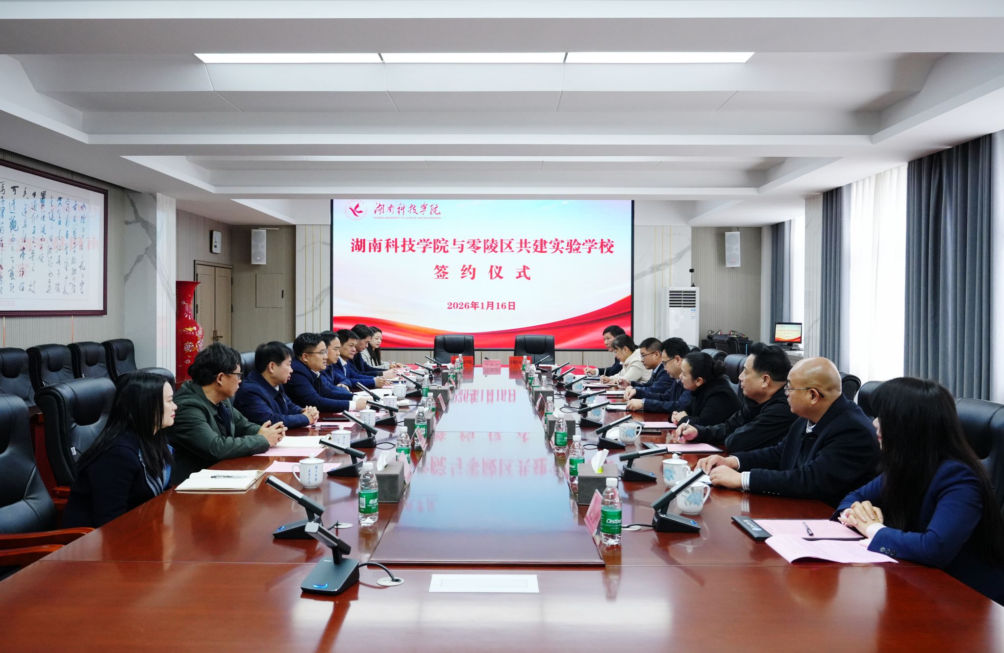 本网讯(记者 向薛峰 摄影 谢志豪)1月16日,学校举行与零陵区共建实验学校签约仪式,零陵区委书记赵立平,零陵区副区长秦明明,校党委书记李钢,党委副书记、校长黄创霞,校党委委员、副校长李常健等出席仪式,零陵区教育局、永州市柳子中学、永州市第九中学、零陵区杨梓塘小学相关负责人参加仪式,黄创霞主持仪式。