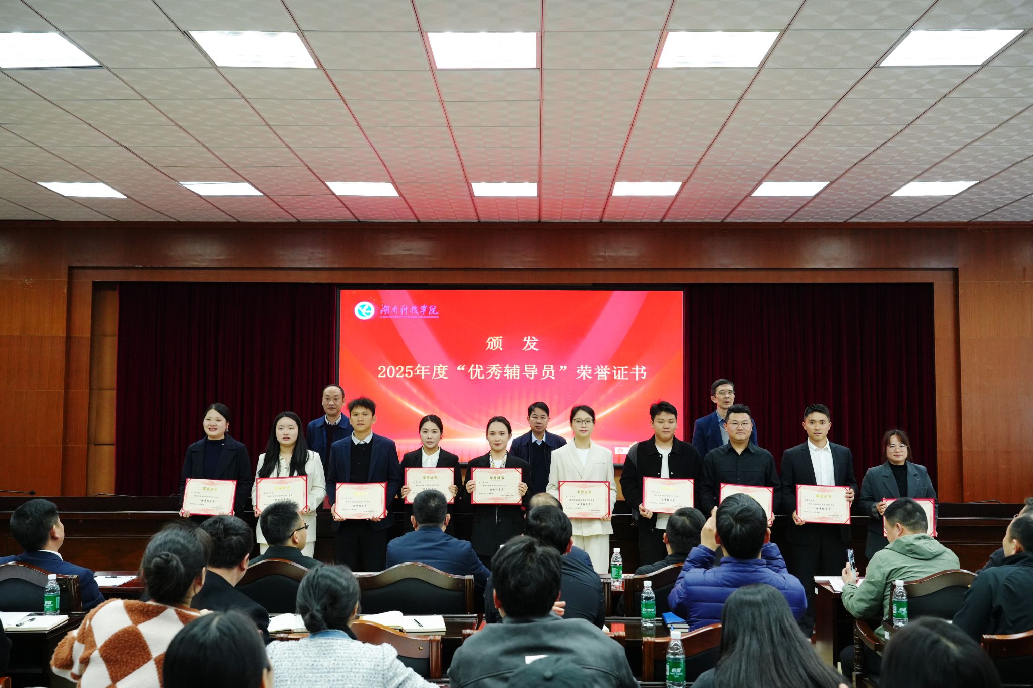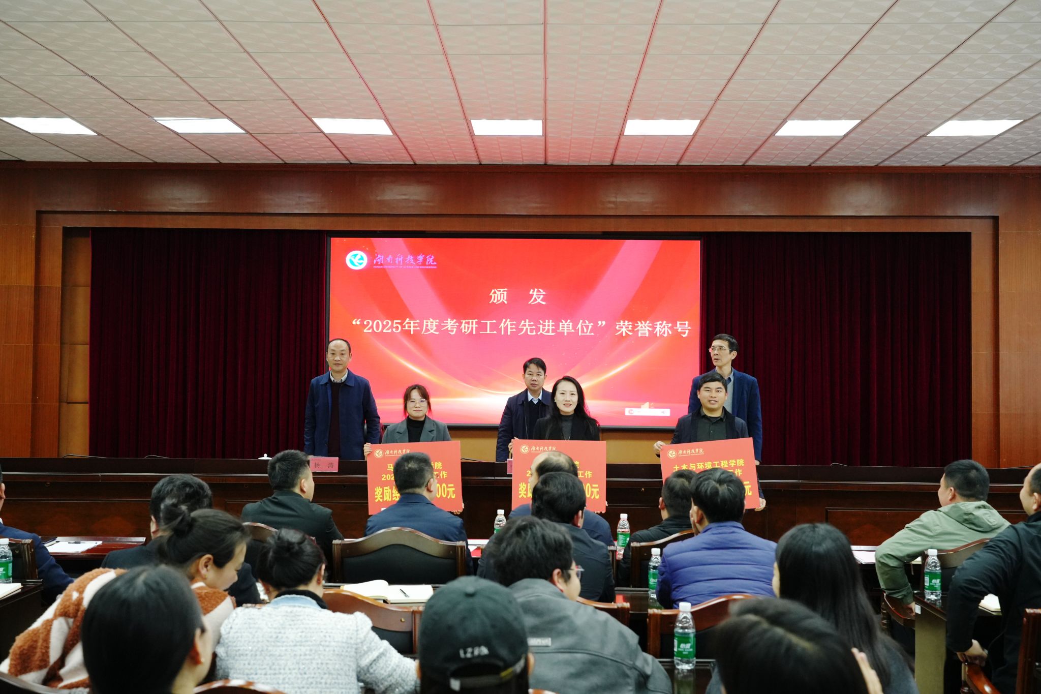 陈灿军宣读表彰文件。校领导分别为2025年度考研工作先进单位和10位“优秀辅导员”颁发荣誉证书。