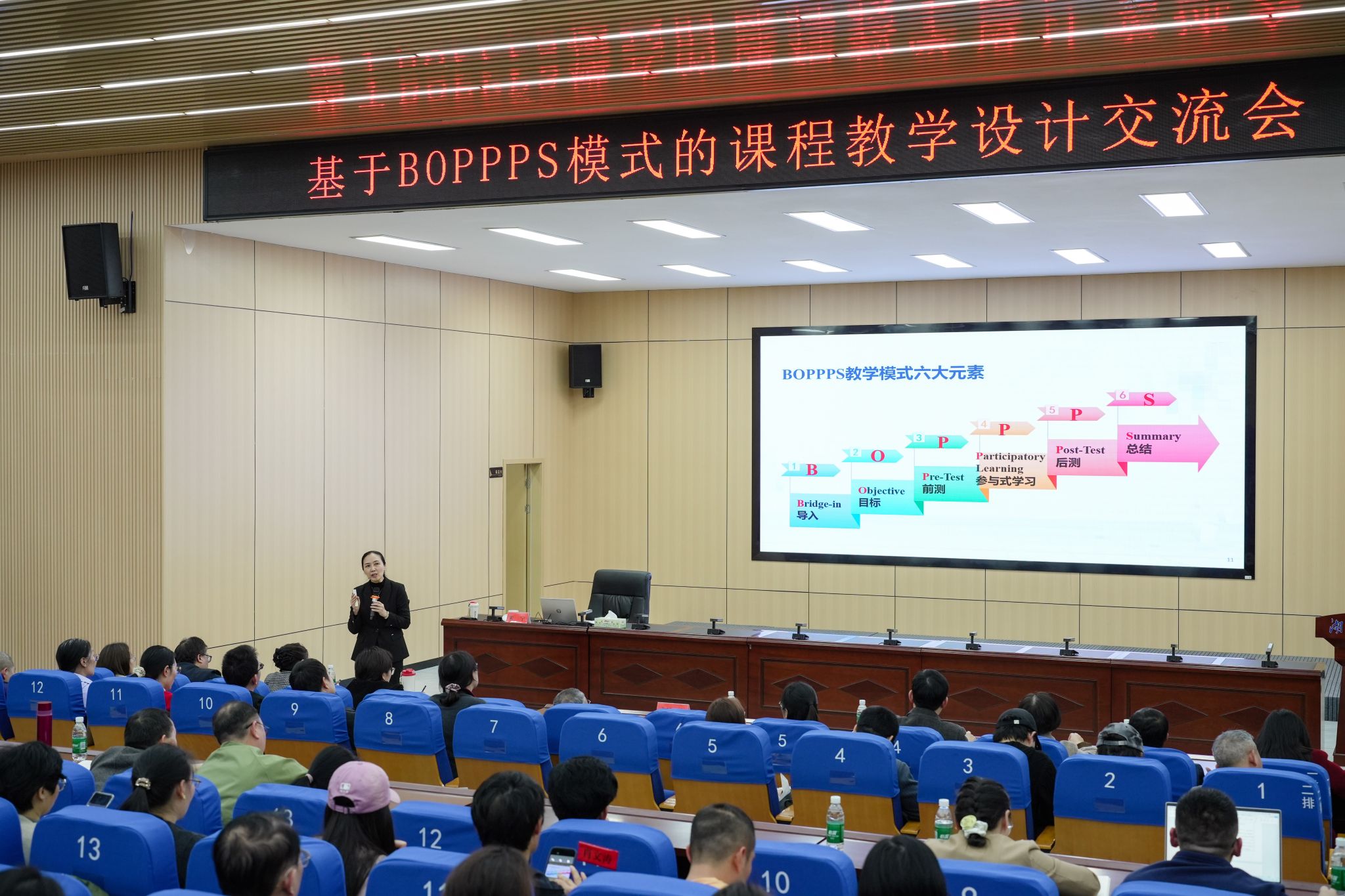 培训会上,两位专家围绕BOPPPS教学模式的核心内涵展开深入解读,详细拆解了导入、目标、前测、参与式学习、后测、总结六大核心环节,结合高校教学实际案例,通过互动问答、案例剖析、经验分享等丰富形式,生动演示了该教学模式在课堂教学中的具体应用方法,清晰阐释了如何将“以学生为中心”的教学理念融入各教学环节,破解课堂教学中的常见难题。参训教师认真聆听、积极互动,主动交流教学困惑与实践心得,现场学习氛围浓厚。