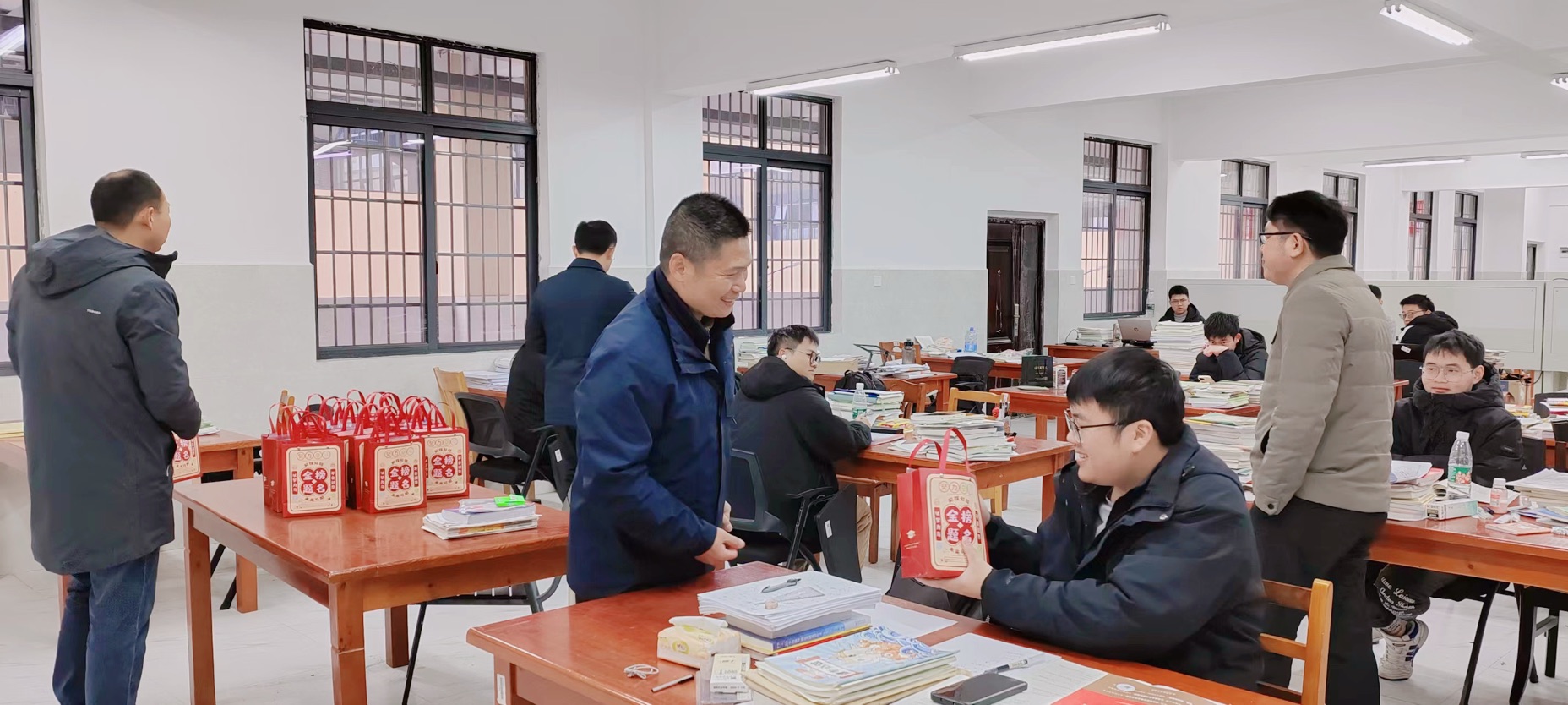 马克思主义学院的老师们来到学生寝室,叮嘱考研学子要放平心态,注意调整身体状况和心理状况,以最佳的状态去迎接考试,并为考研学子送上考研加油包,内含钥匙扣、橙子、巧克力棒、暖宝宝等物品,寓意上岸与你“环环相扣”、马到“橙”功、苹”安顺利、巧”克难题、温“暖”研途,表达学院对考研学子的美好祝愿。