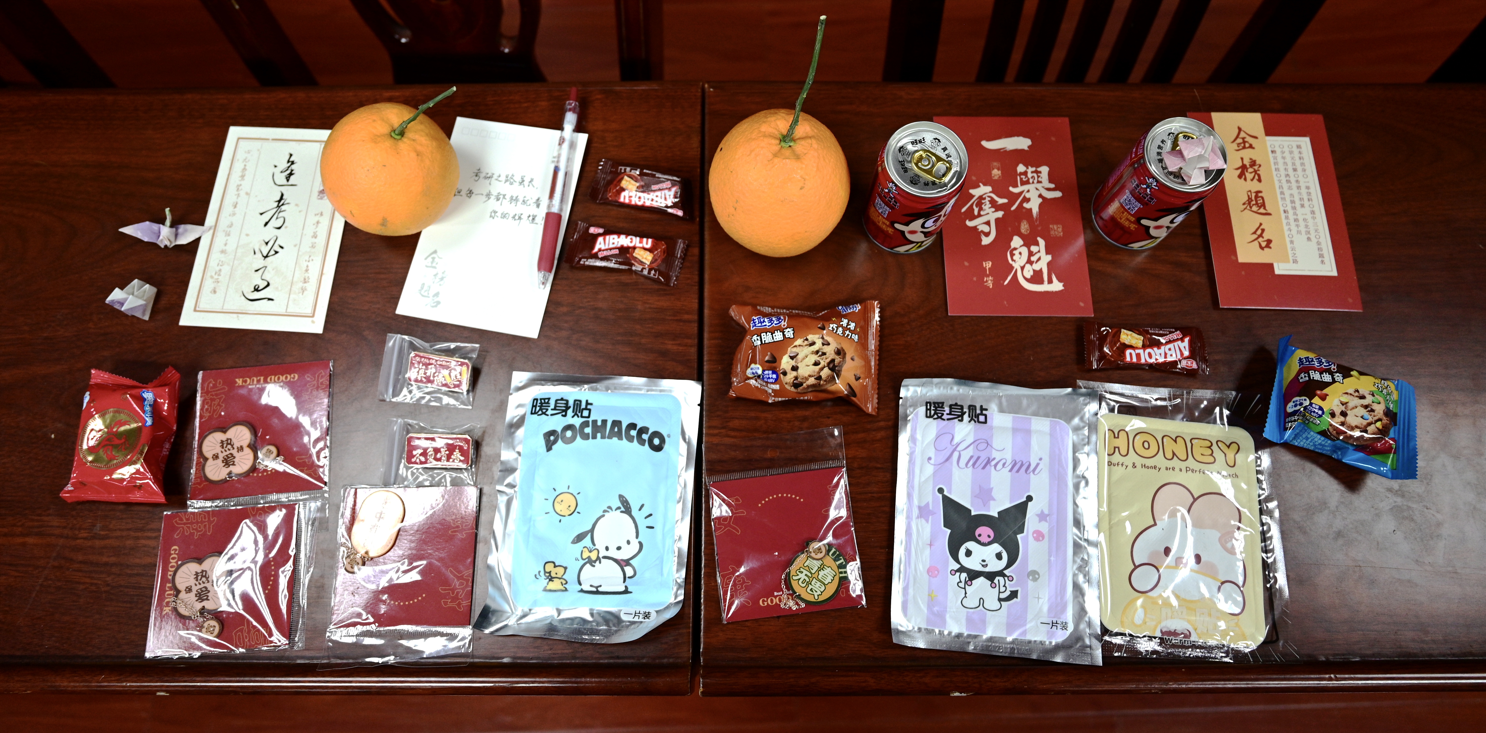 化学与生物工程学院为考研学子精心准备了具有美好寓意的“金榜题名”加油包。加油包内备有暖心贴5份、补充能量的巧克力、有“心想事成”字样的棉花糖,成绩旺旺的旺仔牛奶糖……祝福考研学子成功上岸,一战成硕!