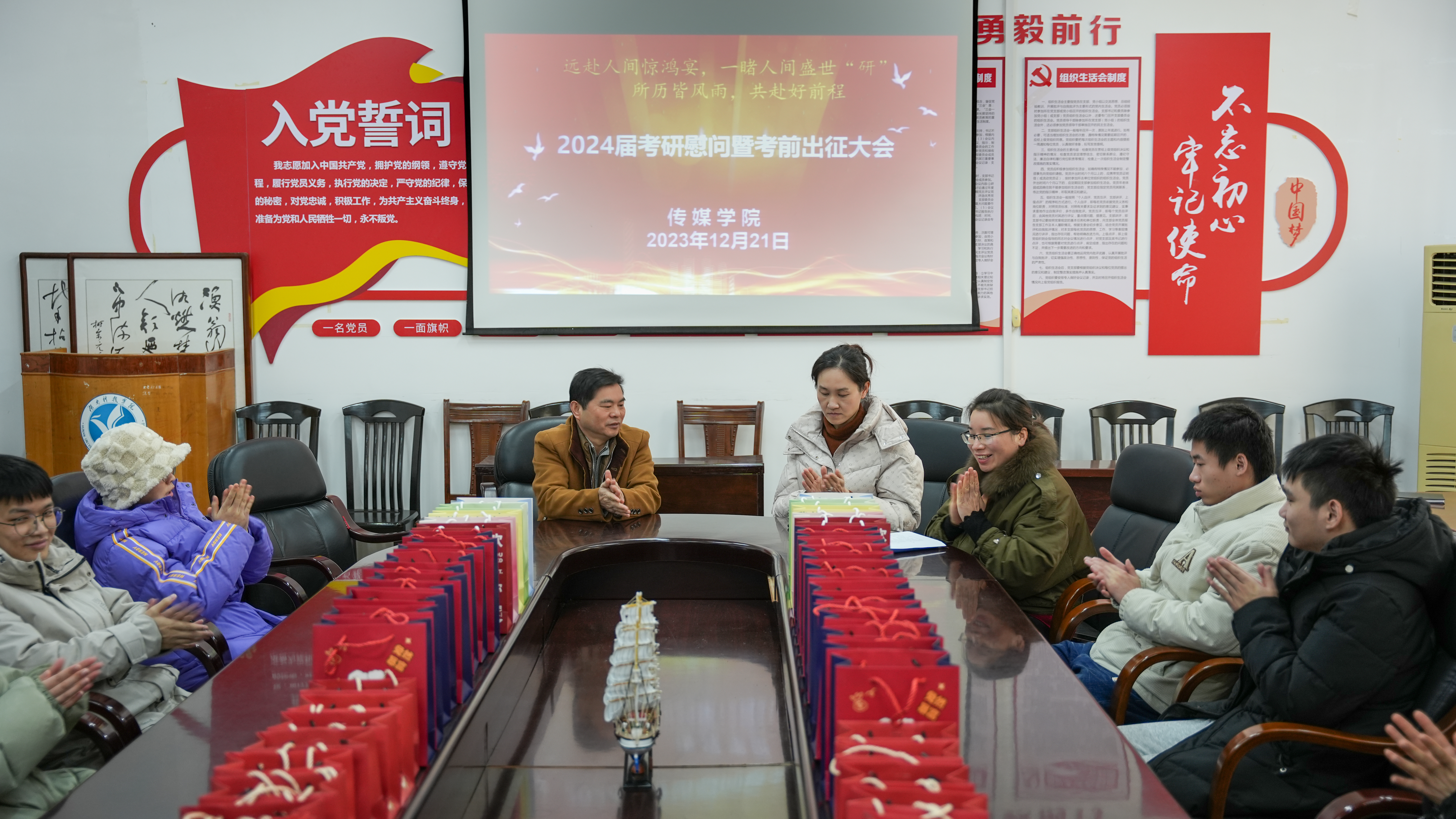 传媒学院举行考研出征大会,向考研学子们送上最真挚的祝福,祝愿考生“一击即中”、“一战成硕”,并为每一位学子分发考研“加油包”。包括“福‘袜’加身,一顺到底”的袜子、“苹”安上岸的苹果,代表着学院对同学们的美好祝愿和殷切期待。