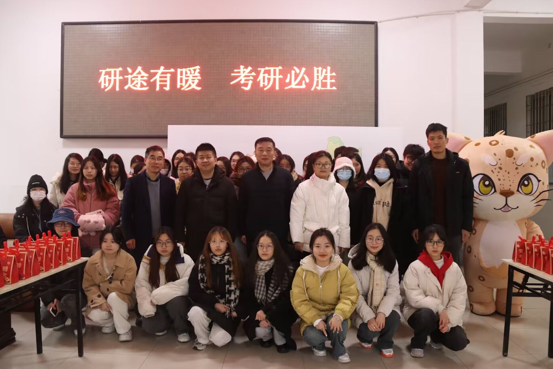 经济与管理学院举办“研途有暖”给考研学生送温暖活动,考研学子在希望树上按下代表决心与努力的手印,将满载心意的祝福卡片亲手粘贴在地图上自己目标院校所在地,同时学院的吉祥物——金金和贝贝为考研学子送上了温暖的拥抱,并带来了学院师生亲手制作的刮刮乐祝福与考研福袋,给考研学子送去最真切的关心、最温暖的问候。