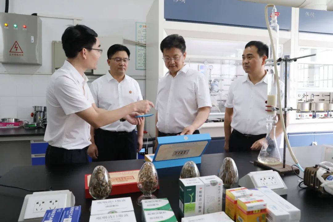 陈爱林一行来到化学与生物工程学院,详细了解市十大科技创新项目——“中药大品种培育研究与应用”项目在产品研发、技术创新、转化推广等方面的进展情况。随后召开座谈交流会。陈爱林表示,科技创新是引领高质量发展的强劲动力。要深入开展“政校企”一体合作,支持具有核心竞争力的企业与bat365中文官方网站组建创新联合体,实现共建共享、合作共赢。要坚持企业创新主体地位,聚焦市场需求,引导企业加大研发投入,加强技术攻关,推动“科创链与产业链”融合发展。要精准精细服务企业发展,帮助企业解决实际困难,特别是要帮助专精特新企业提高创新能力,更好发挥引领作用。要大力推进十大科技创新项目建设,以科技创新引领产业创新,不断培育新动能塑造新优势,力争在打造具有核心竞争力的科技创新高地上发出更多永州声音。