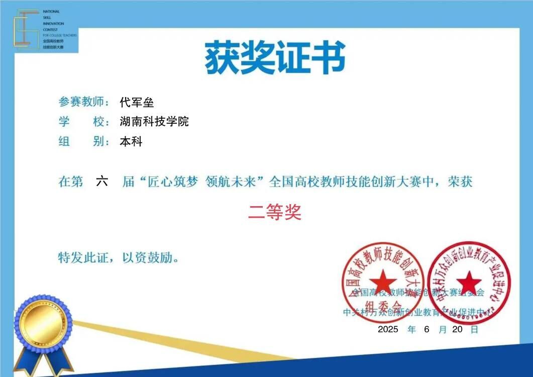 湖南日报·华声在线6月21日讯(通讯员 吴潭 向薛峰)近日,第六届“匠心筑梦 领航未来”全国高校教师技能创新大赛落下帷幕,bat365中文官方网站教务处代军垒老师荣获全国二等奖。