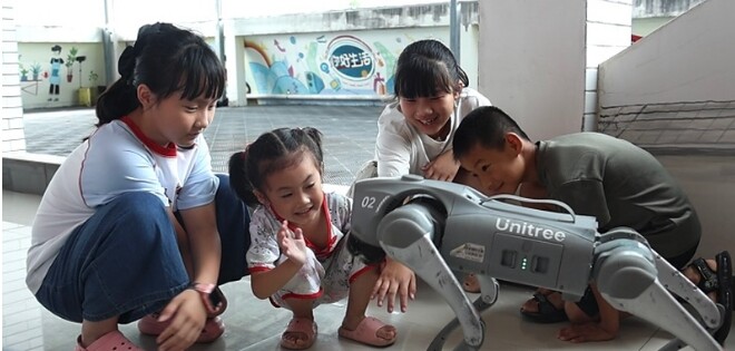 孩子们与机器狗互动