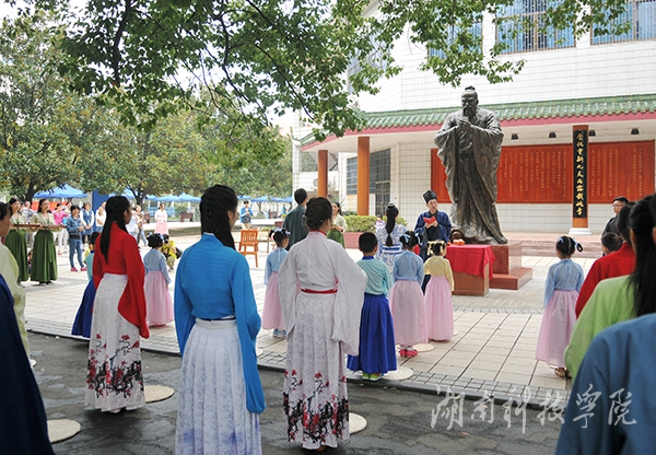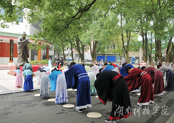 红网永州站9月27日讯(通讯员 熊玲芝 摄影 何帅文)“弟子规,圣人训,首孝悌,次谨信,泛爱众,而亲仁,有余力,则学文……”为纪念孔子诞辰2566周年,宣扬传统文化,弘扬尊师重道之精神,9月27日,在bat365中文官方网站孔子雕像前,数十名学子身着朱子深衣,向孔子像鞠躬按照古礼行“释菜礼”,表达今人对圣贤的敬仰和怀念。