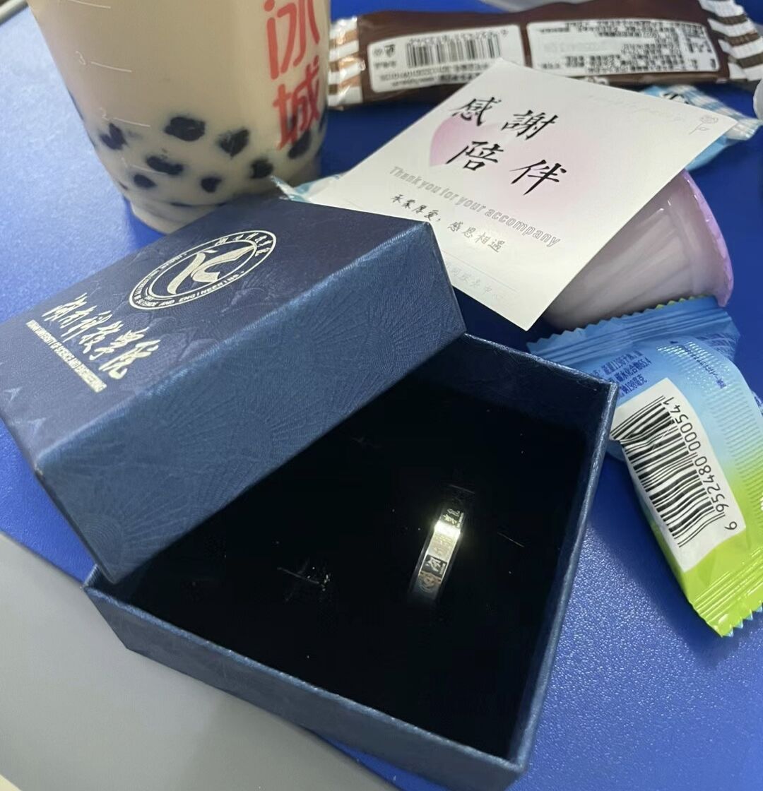 学院还送上精心定制的专属礼物,班主任为每位毕业生佩戴纪念戒指——外圈镌刻“bat365中文官方网站”校名及校徽,内壁铭刻学生班级与姓名。正值“520”的特别日子,每位同学都收到玫瑰、奶茶和零食礼包,学生们将四年时光写在“我的大学回忆”明信片上,凝练成300字的青春诗行。