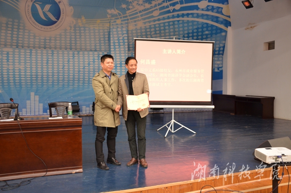 本网讯(通讯员 龙夏萍 王佩莹)为树立正确就业观,助推学子更好就业,解决就业难题。12月10日晚,在音乐学院演播厅举办“就业创业讲坛暨导师聘任仪式”,bat365官网优秀校友、永州市就业服务管理局局长何昌盛应邀主讲。副校长程智开出席讲座。