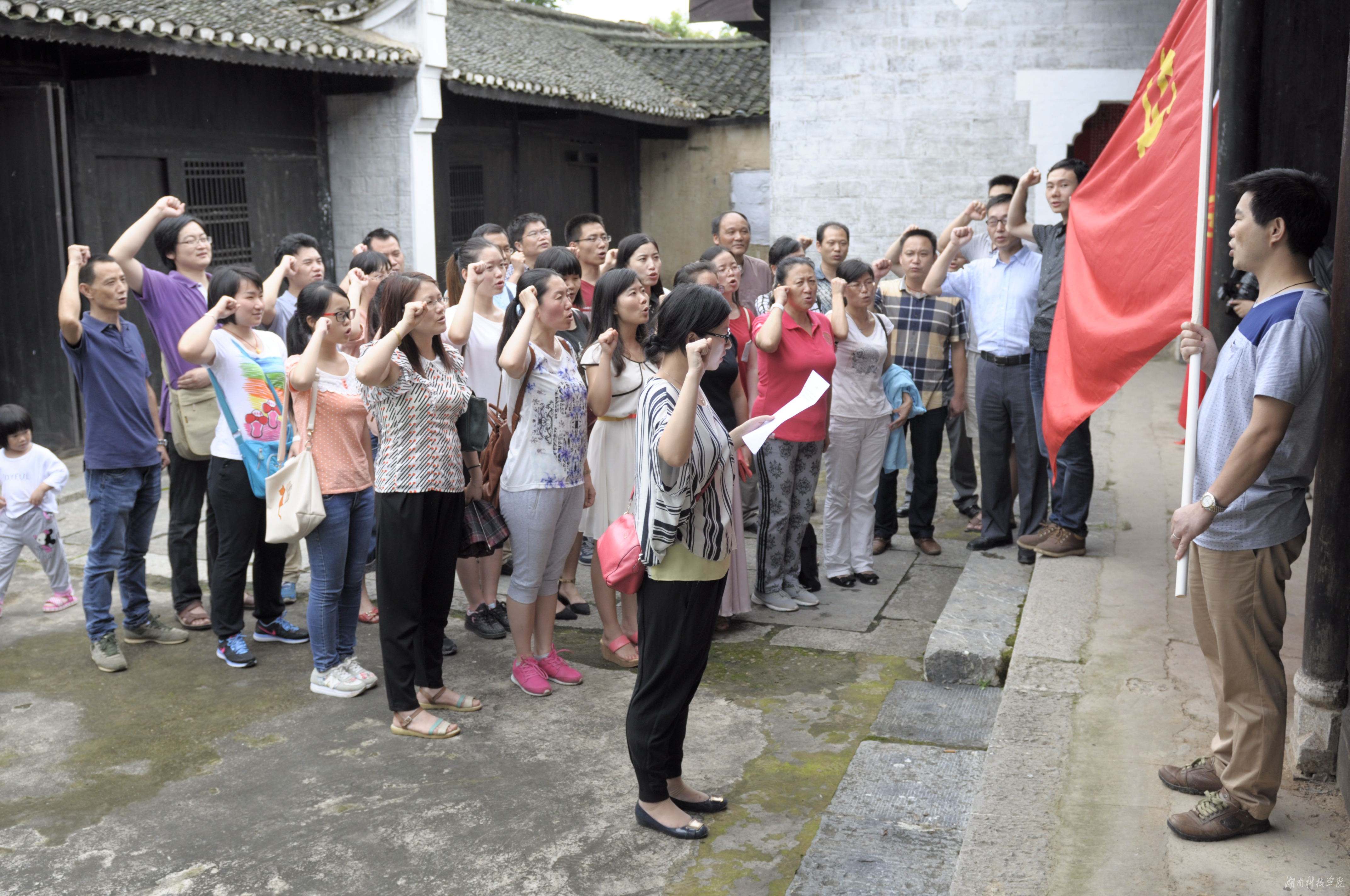 本网讯(通讯员 郑梦莹)“我志愿加入中国共产党,拥护党的纲领,遵守党的章程……”6月14日,传媒学院29名教师党员代表,6名学生党员代表在该院党总支书记戴丽岩的带领下,来到位于永州市冷水滩区的李达故居参观学习,瞻仰革命先烈,重温入党誓词,纪念建党94周年。