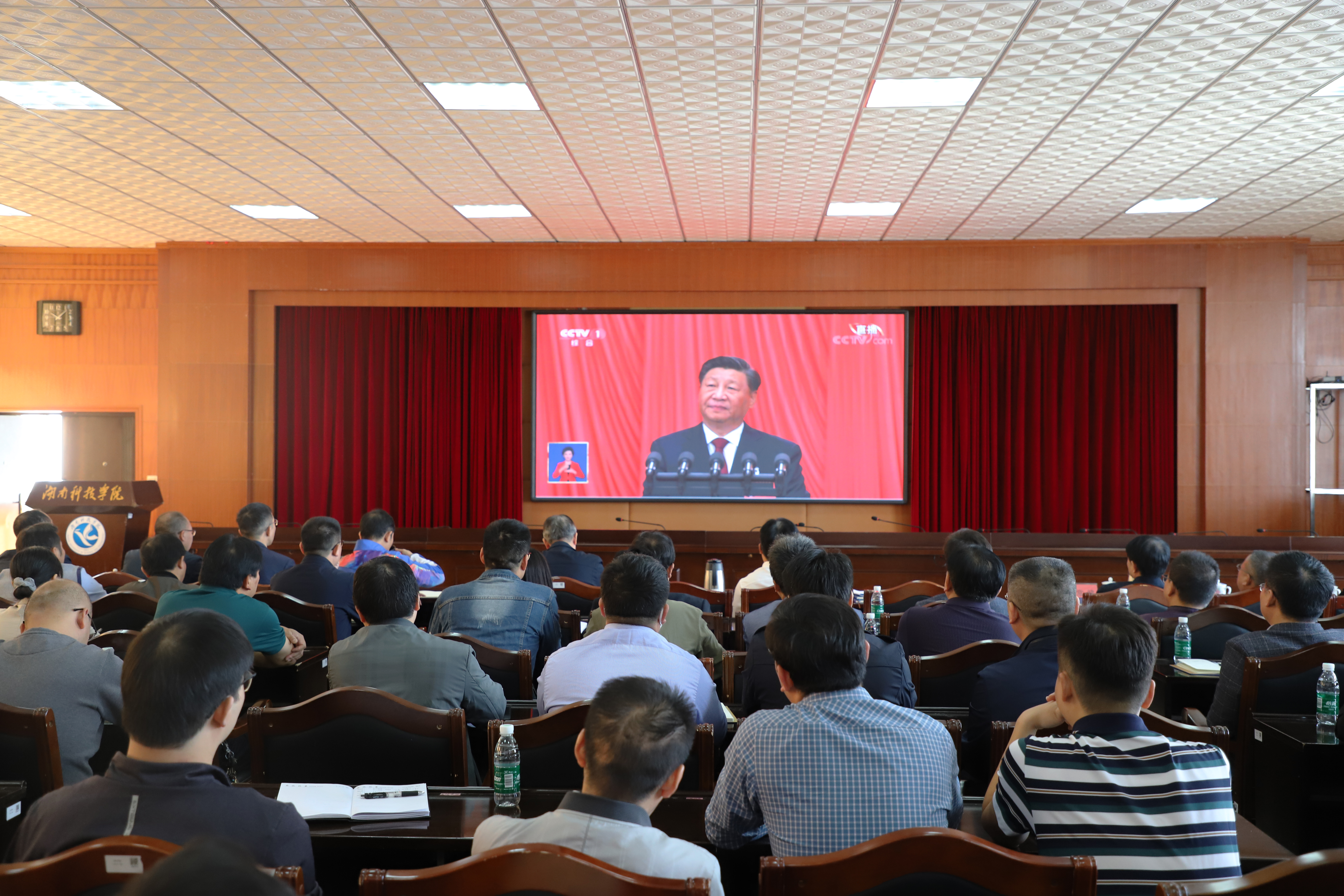全体校领导、机关和教辅部门的党员干部在学校办公楼八楼一会议室集中收看开幕会,党校第四十三期党员发展对象和学生干部在潇湘大讲堂集中收看,各教学学院分别在多媒体教室、学生宿舍等场所集中进行收看。大家聚精会神,认真聆听,并认真记录报告内容,现场不时响起热烈掌声。