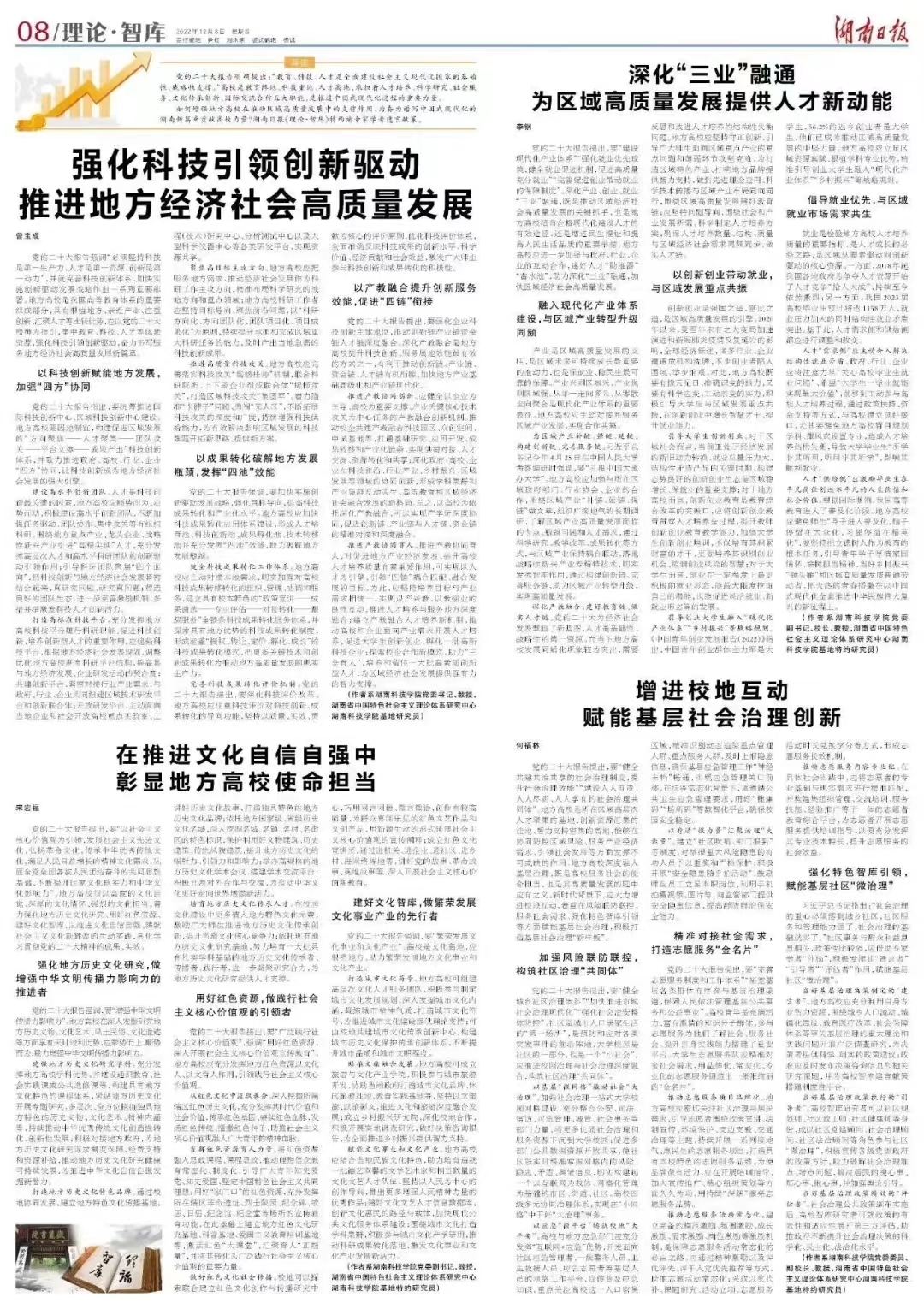 本网讯 党的二十大报告明确提出:“教育、科技、人才是全面建设社会主义现代化国家的基础性、战略性支撑。”围绕学习贯彻落实好党的二十大精神,12月8日,《湖南日报》第八版(理论·智库)整版刊发了bat365官网四篇理论文章,文章聚焦地方高校在推动区域高质量发展中发挥支撑作用、为奋力谱写中国式现代化的湖南新篇章贡献高校力量谈思路举措,在主流媒体发出科院声音。
