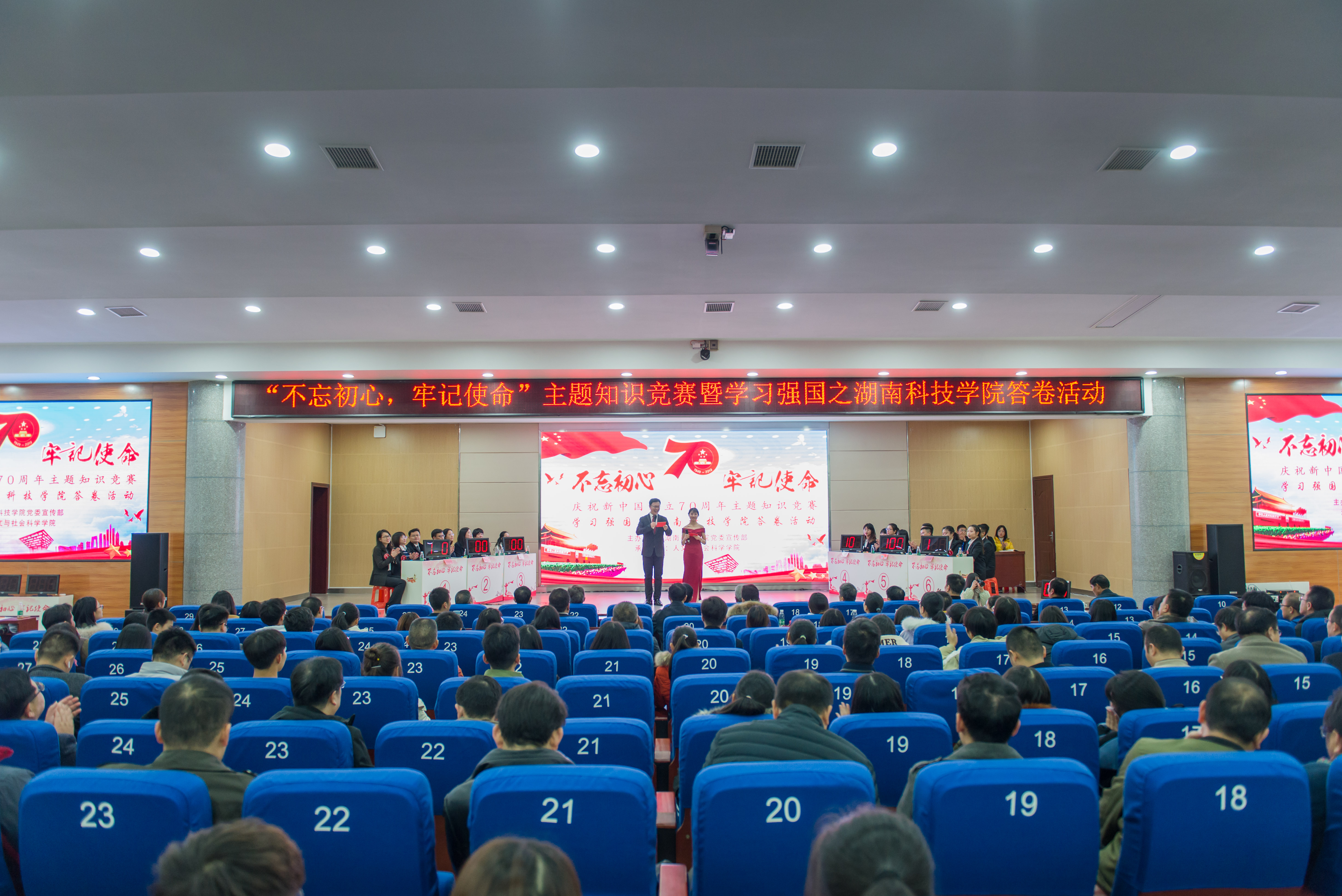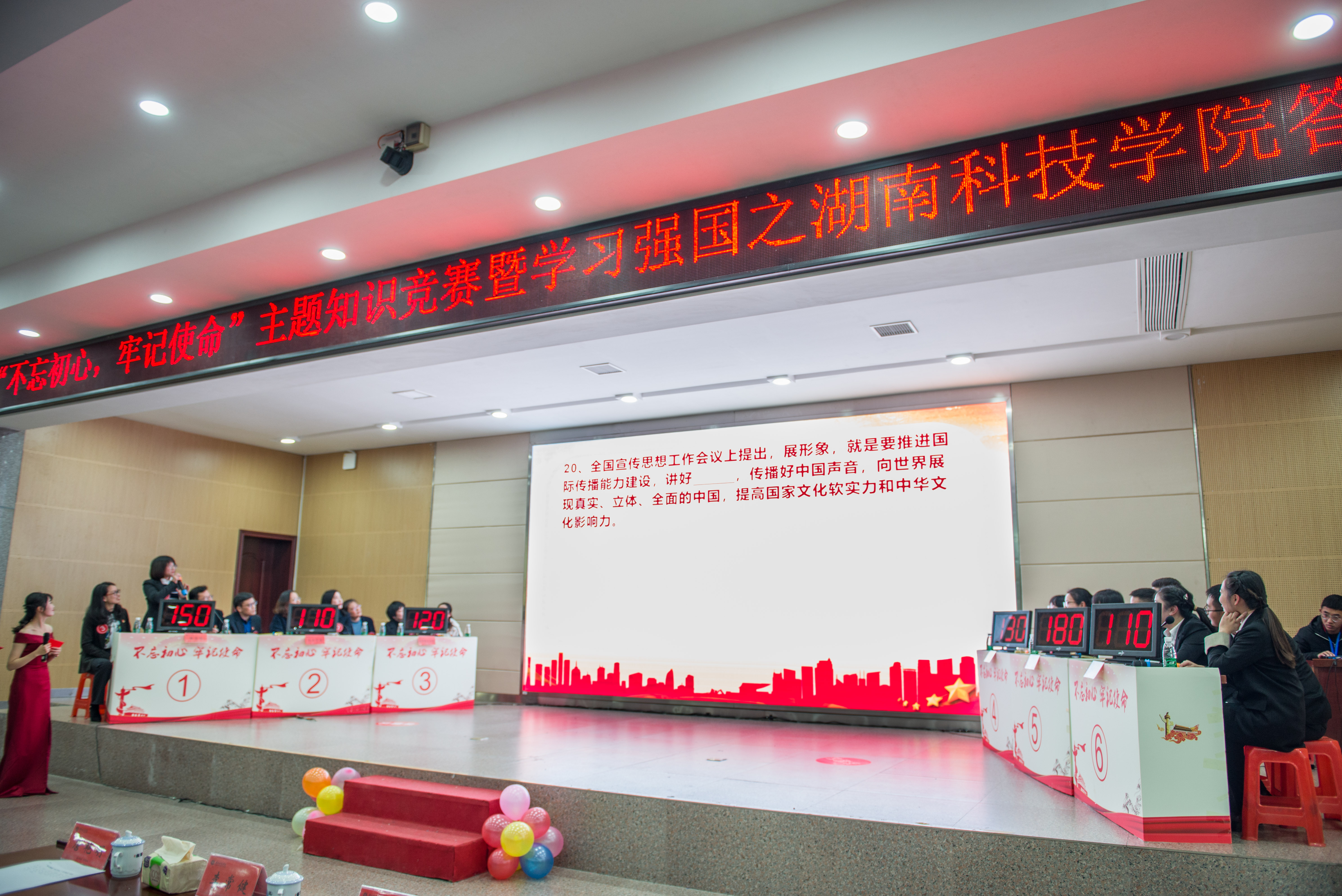 本网讯 11月27日晚,由党委宣传部主办,人文与社会科学学院承办的“不忘初心,牢记使命”主题教育知识竞赛决赛暨“学习强国”学习标兵表彰大会在潇湘大讲堂举行。校党委书记曾宝成,校长李钢,校领导唐艳明、宋宏福、李常健、吴小林、程智开,全体副处级以上党员干部、参赛队员、受表彰人员和学生党员800余人参加。