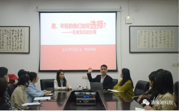 近日,文法学院党总支结合“一月一课一片一实践”活动要求和工作实际,组织开展了毕业生“最后一课”系列活动。5月11日,文法学院为毕业生党员上了一堂特殊的党课,进行了党性和廉洁教育,引导他们扣好职场 “第一粒扣子”。学院党总支副书记欧阳智超、全体辅导员以及学院全体在校毕业生党员参加活动。