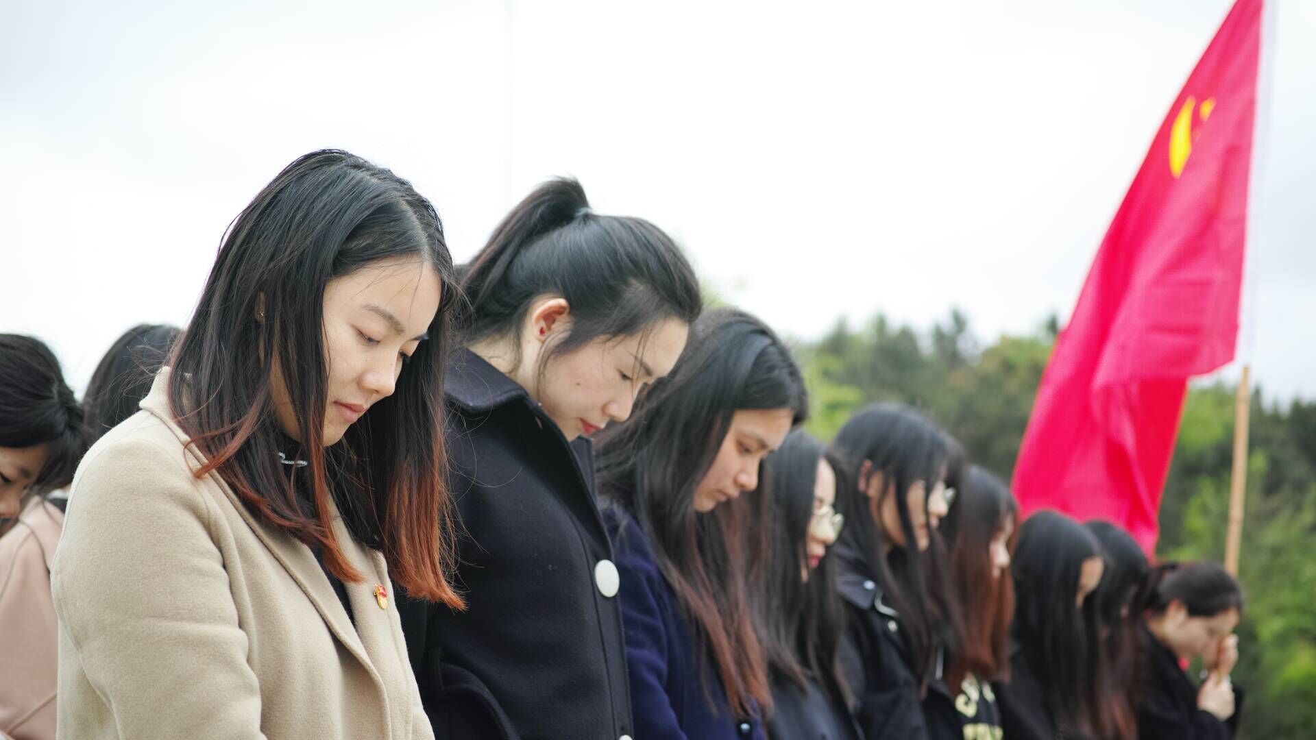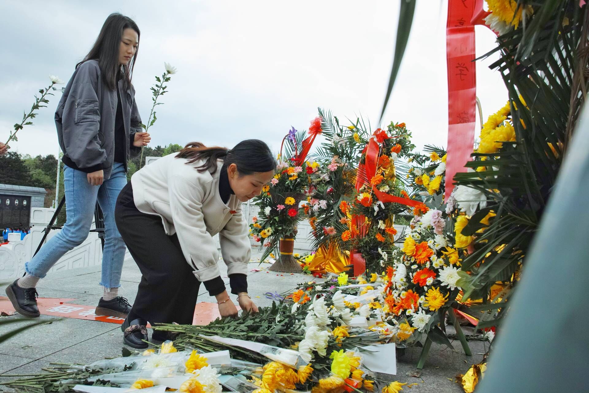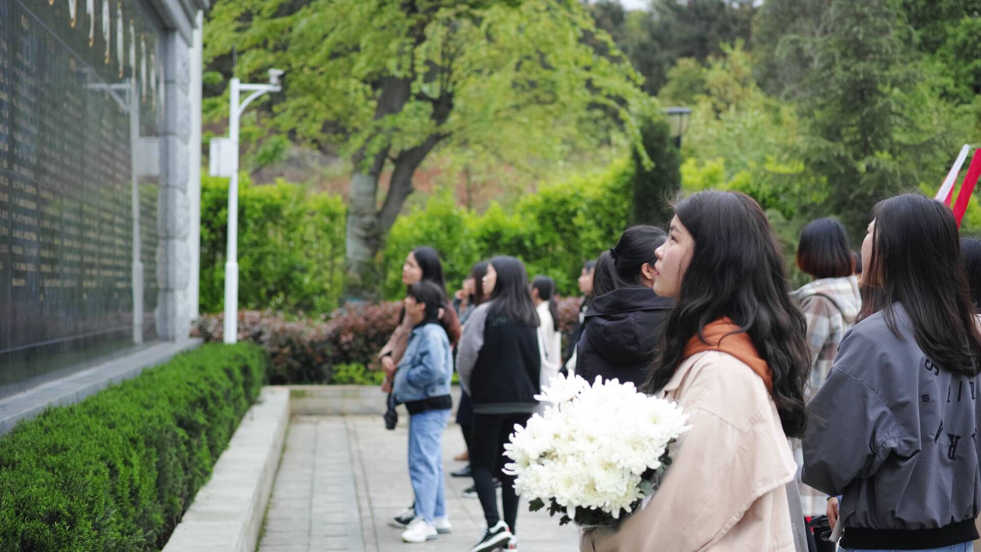 青年学子向烈士纪念碑行“三鞠躬”礼:缅怀先烈事迹,弘扬先烈精神,传承先烈遗志。礼毕,全体人员肃立默哀。随后,同学们怀着无比崇敬的心情,依次走向纪念碑向革命烈士敬献鲜花。