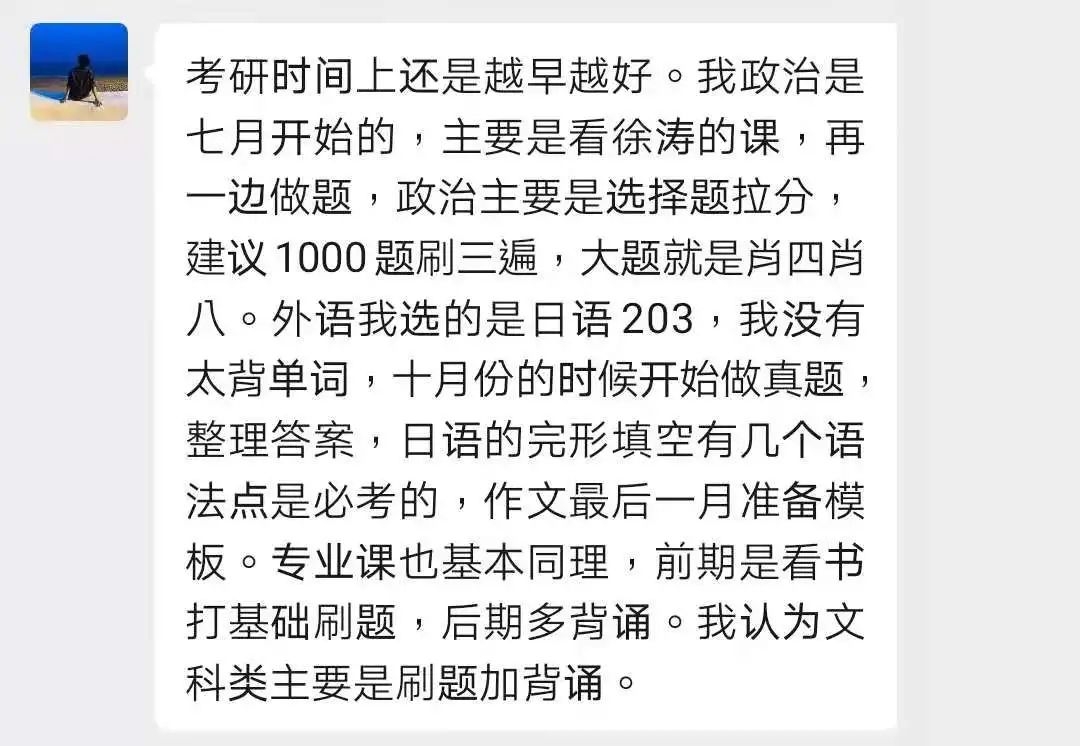 李金泽:我认为考研越早越好,我是三月底去定院校专业,在家复习一段时间后,六月在学校附近复习的。对于文科类,我个人经验认为前期刷题打基础,后期背诵强化记忆。