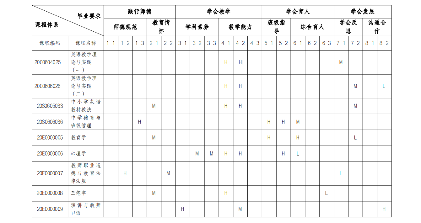 注:根据毕业要求与课程目标、课程内容与课程目标的对应关系编制本表,“课程体系支撑毕业要求实现关系矩阵”应覆盖所有 必修环节,开设各课程(理论课程、实践课程)应对毕业要求达成具有一定支撑作用。根据课程对各项毕业要求的支撑强度分别用“H (高)、M(中)、L(弱)”表示,支撑强度的含义是:该课程覆盖毕业要求指标点的多寡,H 至少覆盖 80%,M 至少覆盖 50%,L 至 少覆盖 30%。不必全部支撑,不可能全部支撑,须明确高支撑。