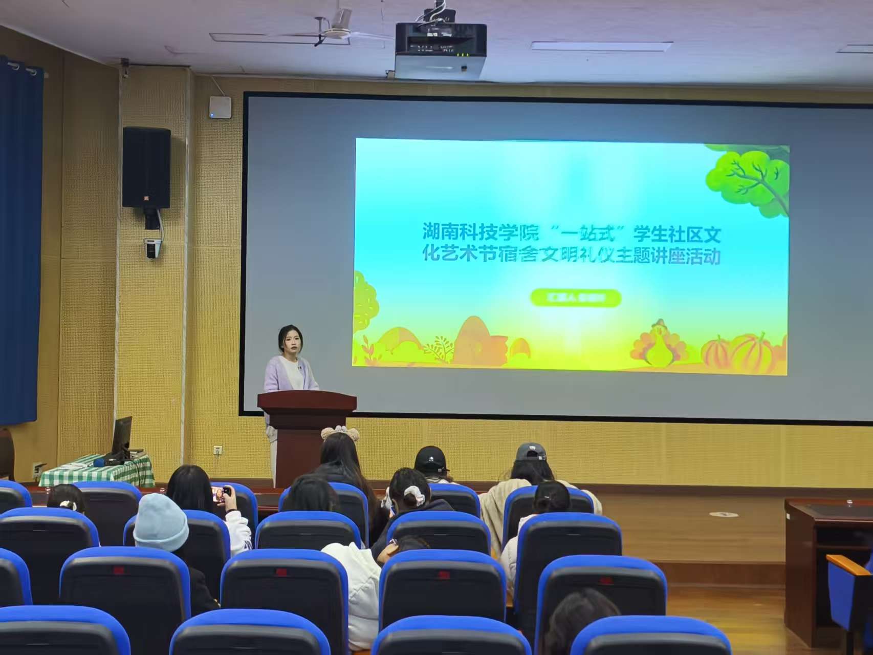 最后,主持人向全场同学发出倡议,号召大家将本次讲座所学的礼仪知识转化为实际行动,从整理个人内务、主动问候室友等细节做起,主动担当文明宿舍建设的实践者与推动者,共同营造整洁有序、互助友爱的住宿氛围。