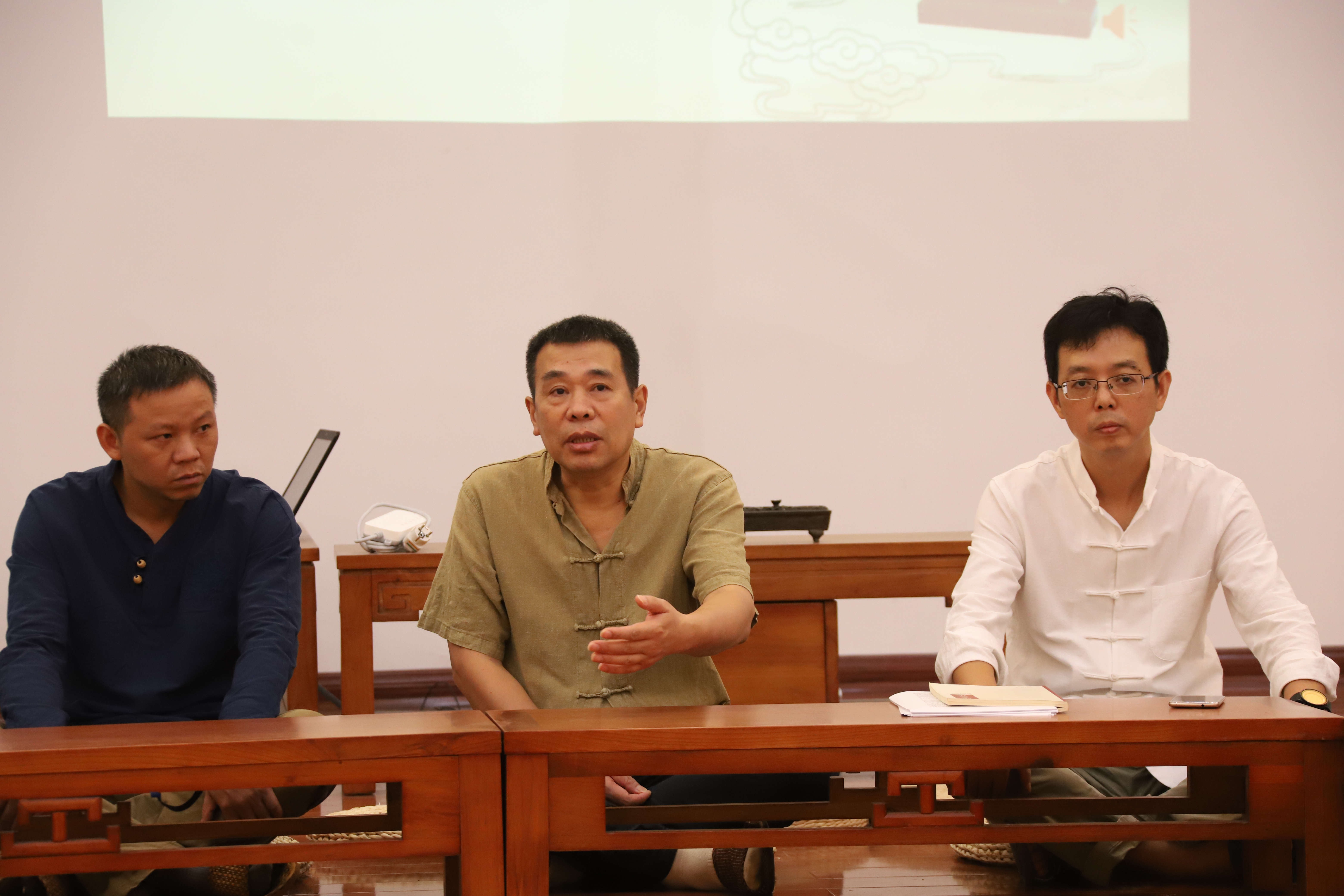 讲座在美轮美奂的集贤楼小成堂举行,男老师们穿着唐装,国学院17级学生穿着自己缝制的淡蓝色汉服,18级新生和其他成员统一穿着青绿色的汉式传统礼服。活动开始前,我们看到17级学生在帮助其他同学系衣带、腰带和缁布冠。讲座伊始,大家分坐在两边,举行了传统的“相见礼”,双手端拱在胸前,相互揖拜,起身,以手加额。礼毕,师生一一席地而坐在蒲团上,统一的素色汉服,统一的青衣黑帽,此时的小成堂仿佛就是古代的书院,开始了最朴素又最具韵味的学术讲座。