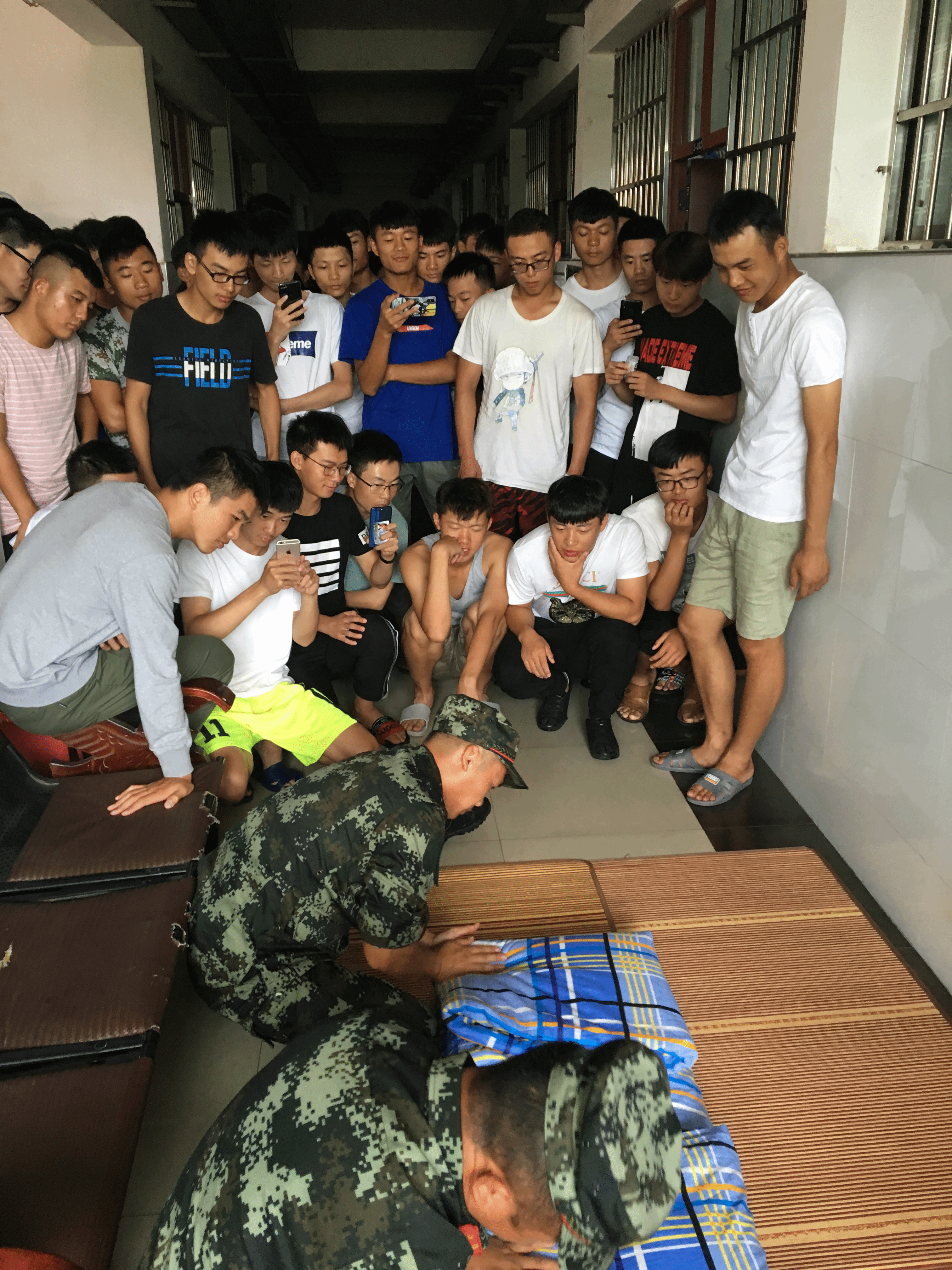 教官们严格按照部队标准,对宿舍物品摆放、被褥叠放、地面清扫等内务方面提出了要求并指出了在整理细节方面的注意事项。随后教官为同学们演示叠被子,被子在教官“叠、压、捋”几个动作之下,变成了四四方方的“豆腐块”,同学们一一跟着学习,寝室里一个个“豆腐块”映入眼帘。