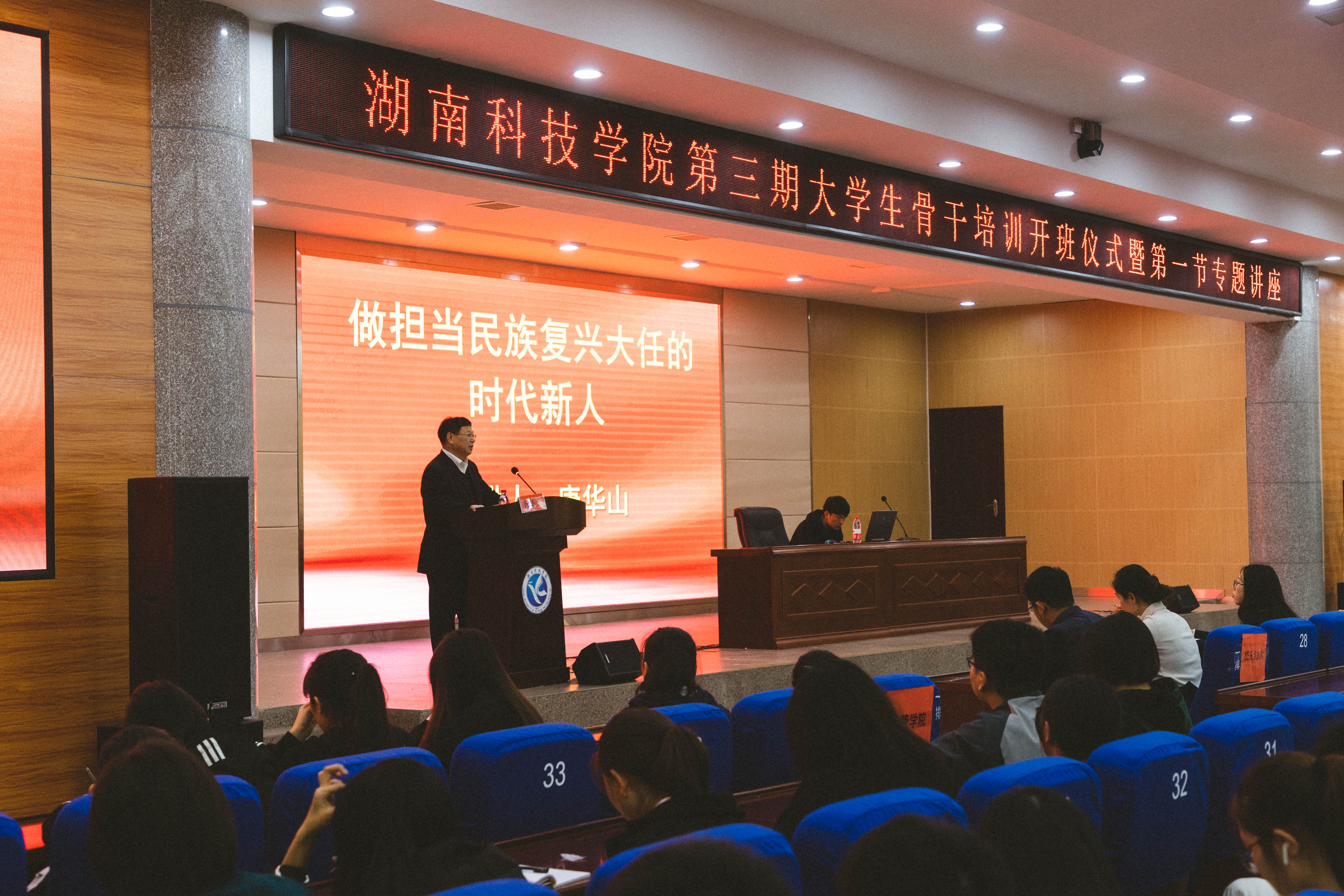 本网讯(通讯员杨涵)10月16日晚,bat365官网第三期大学生骨干培训在潇湘大讲堂举行,校学工部、武装部部长唐华山担任主讲嘉宾,700余名学生骨干参加培训。