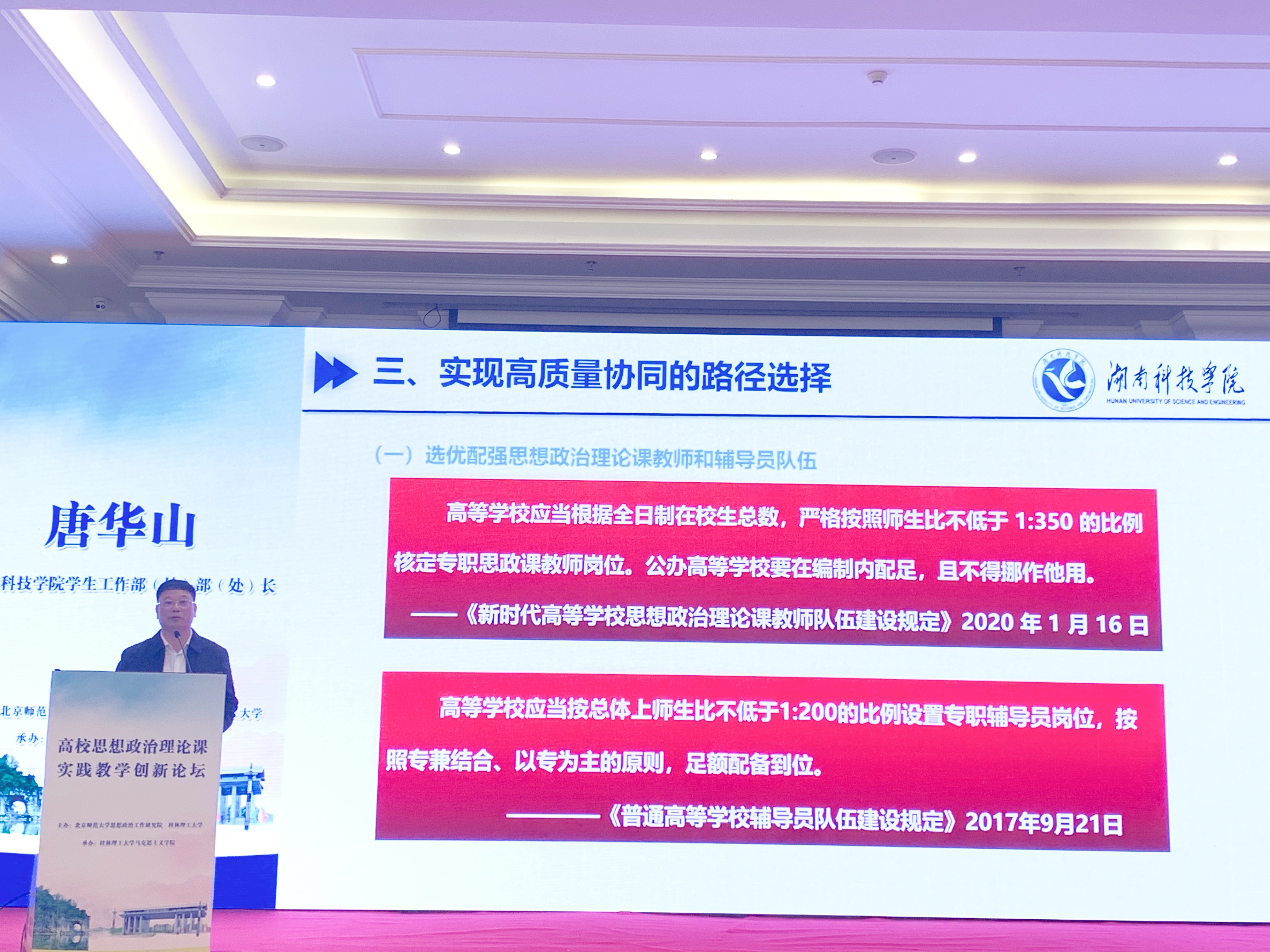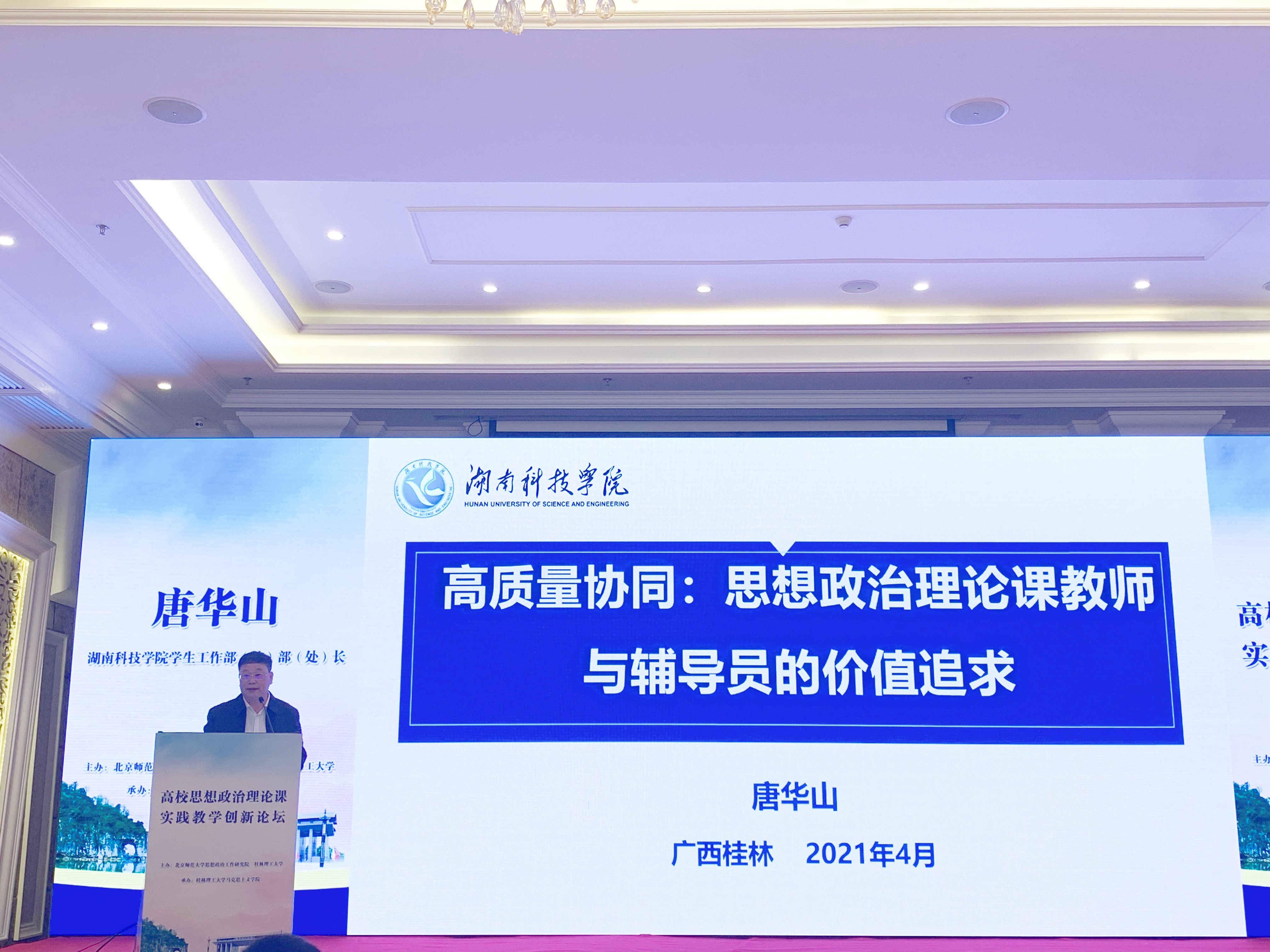 4月10日,由北京师范大学思想政治工作研究院和桂林理工大学共同举办的高校思想政治理论课实践教学创新论坛暨“教育部高校示范马院和优秀教学团队建设重点项目”成果发布会在桂林召开。bat365官网学工部长唐华山应邀参会,并作题为“高质量协同:思想政治理论课教师与辅导员的价值追求”的主题报告。