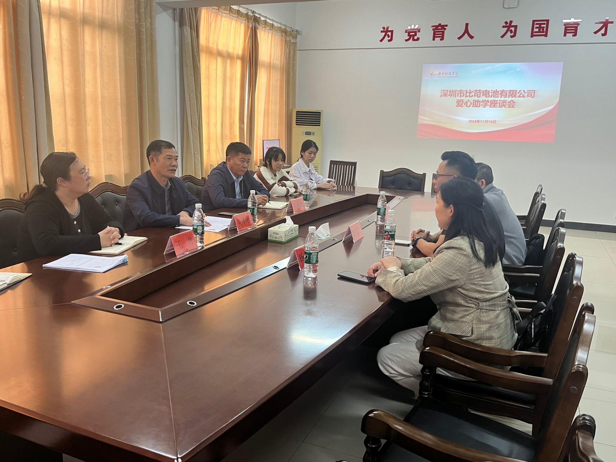 本网讯(学工部)11月10日下午,湖南省比苛慈善基金会、深圳市比苛电池有限公司来校开展爱心助学座谈会。湖南省比苛慈善基金会理事长、深圳比苛电池有限公司总经理李志江及其爱心团队和受资助学生参会,校党委委员、副校长吴小林出席会议并讲话,会议由学生工作部部长谷利民主持。