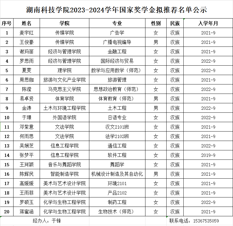 根据湖南省教育厅等5部门关于印发《湖南省学生资助资金管理办法》的通知(湘财教〔2022〕13号)、湖南省学生资助管理中心《关于做好2024年普通高校国家奖助学金评审工作的通知》(湘学助〔2024〕30号)文件要求和《bat365中文官方网站学生奖励办法》、《bat365中文官方网站学生资助管理办法》、《bat365中文官方网站国家奖学金、国家励志奖学金、国家助学金管理办法》有关规定,学工部于2024年9月25日召开资助专干会议,安排部署评奖工作。经学生个人申请,各学院初审、公示,学工部审核。拟推荐化学与生物工程学院蒋蜜涵等20名同学参评2023-2024学年国家奖学金。