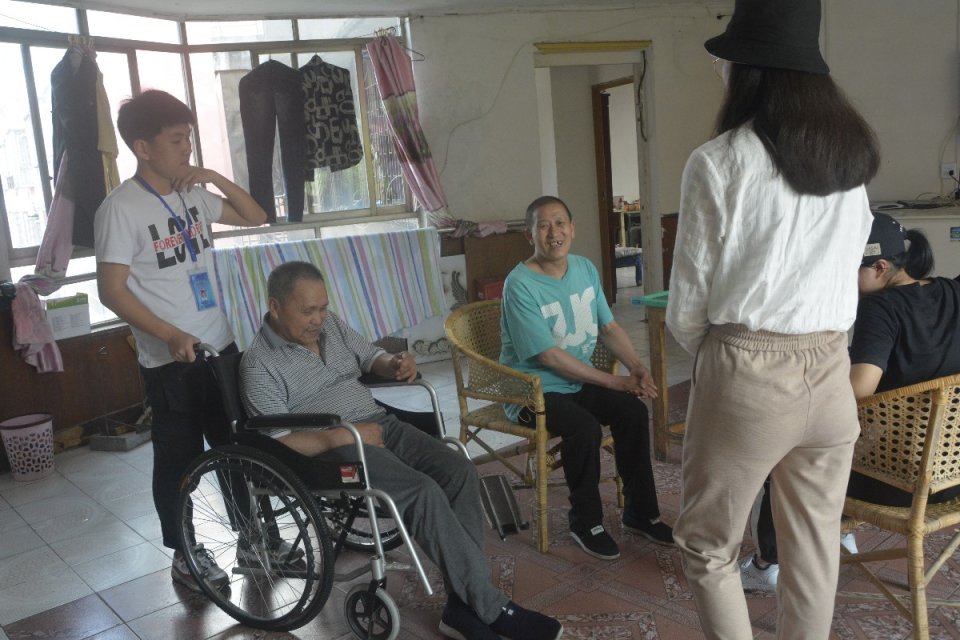 在我们正前方的是一个院子,在门的左手旁是一栋住宿楼,老人们住在一楼,二楼和三楼,这些老人,他们大多是因为子女工作在外比较忙,没时间照顾他们才把他们送到这里,也有的是无儿无女,孤独一身的生活在这里。落寞的眼神、被岁月碾过的脸庞以及驼掉的脊背让我们的心不禁地揪紧。我们和老人围坐在一起,相互交流一起谈心,内心无比的温馨与感动。