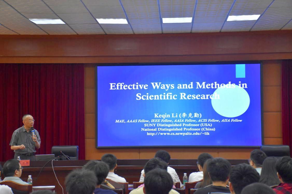 本网讯(通讯员 蒋逸轩 陈星明)5月29日,欧洲科学院院士、纽约州立大学讲席教授、湖南大学信息科学与工程学院国家特聘教授李克勤来校开展学术讲座,讲座由信息工程学院院长尹向东主持,来自学校各学院的学术骨干、青年教师和学生代表120余人等聆听报告。