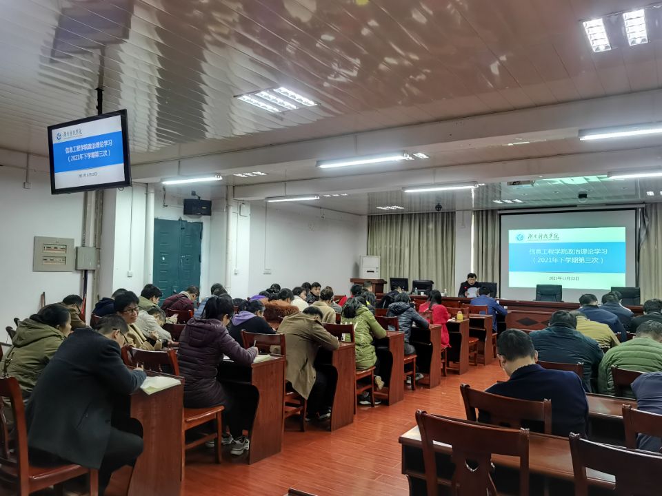 本网讯(通讯员 颜叶娟)11月23日,学院组织召开“学习十九届六中全会精神”专题学习会议,全体教师参加学习。党总支书记谢一民领学《中国共产党第十九届中央委员会第六次全体会议公报》、《中共中央关于党的百年奋斗重大成就和历史经验的决议》、习近平总书记关于《中共中央关于党的百年奋斗重大成就和历史经验的决议》的说明等文件,带领全体教师共同学习领悟党的十九届六中全会精神。学院党总支副书记夏汉伟,教工第二党支部书记文海英、副书记杜丹蕾分别结合工作实际作学习交流发言。