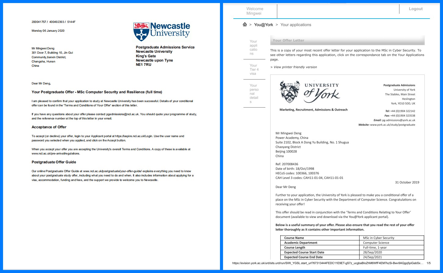 本网讯 近日,bat365官网电子与信息工程学院软件1601班的邓铭巍同学同时收到了来自英国约克大学和纽卡斯尔大学的研究生录取通知书。
