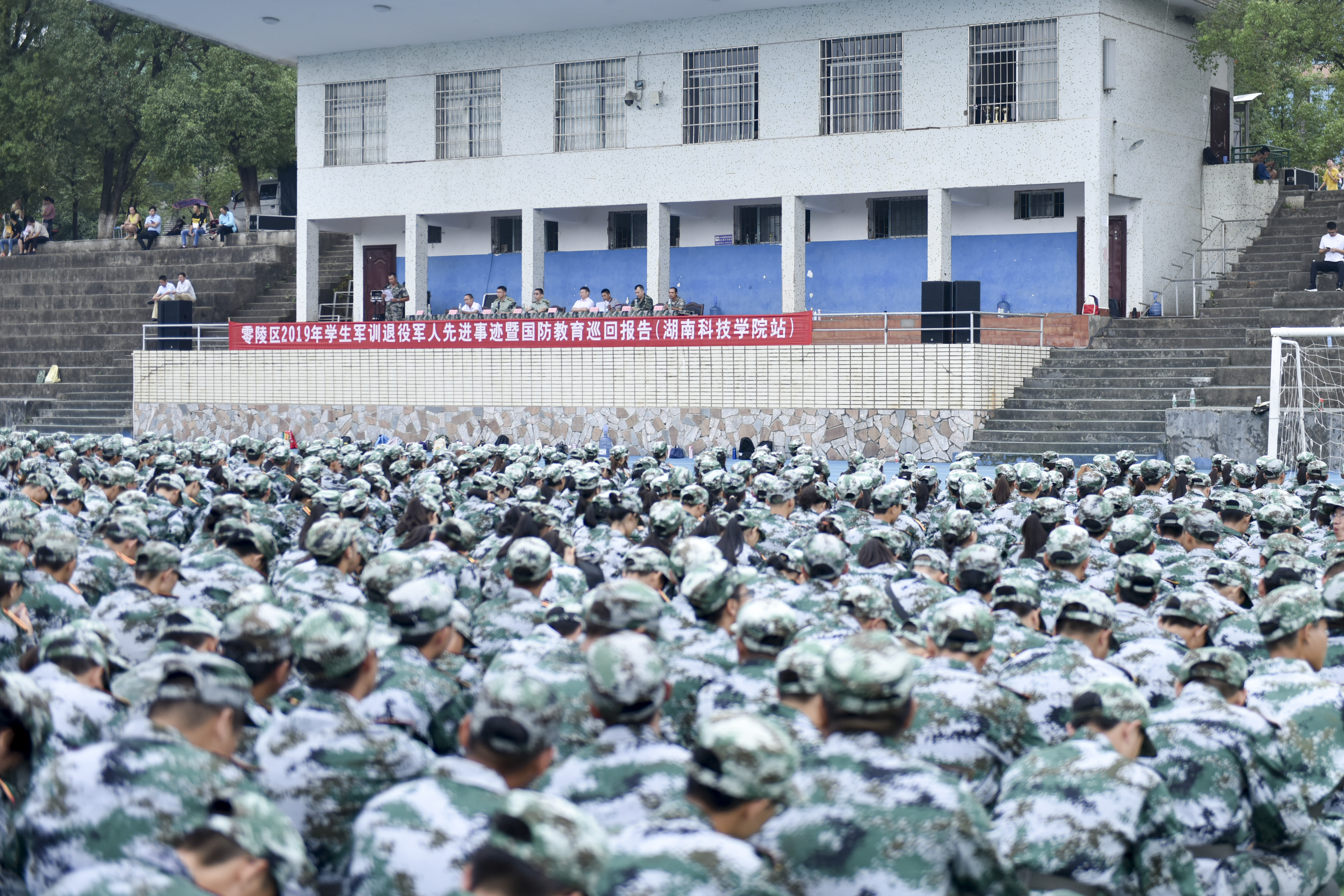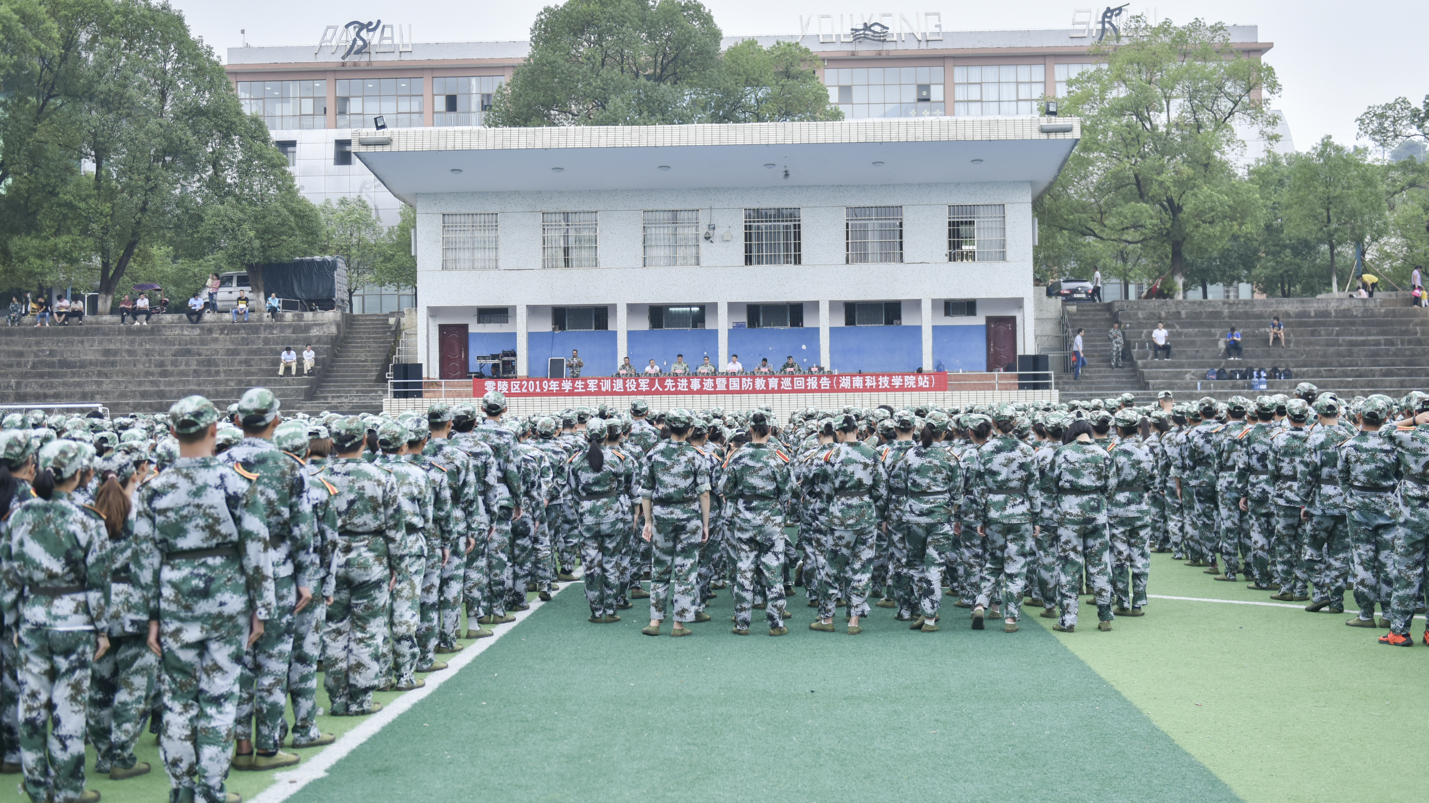 本网讯 9月17日上午,零陵区2019年学生军训退役军人先进事迹暨国防教育巡回报告在学校举行,bat365官网2019级4000余名新生参与活动,在紧张的军训间隙接受了一堂深刻的国防教育课,感受报国情,共筑国防梦。