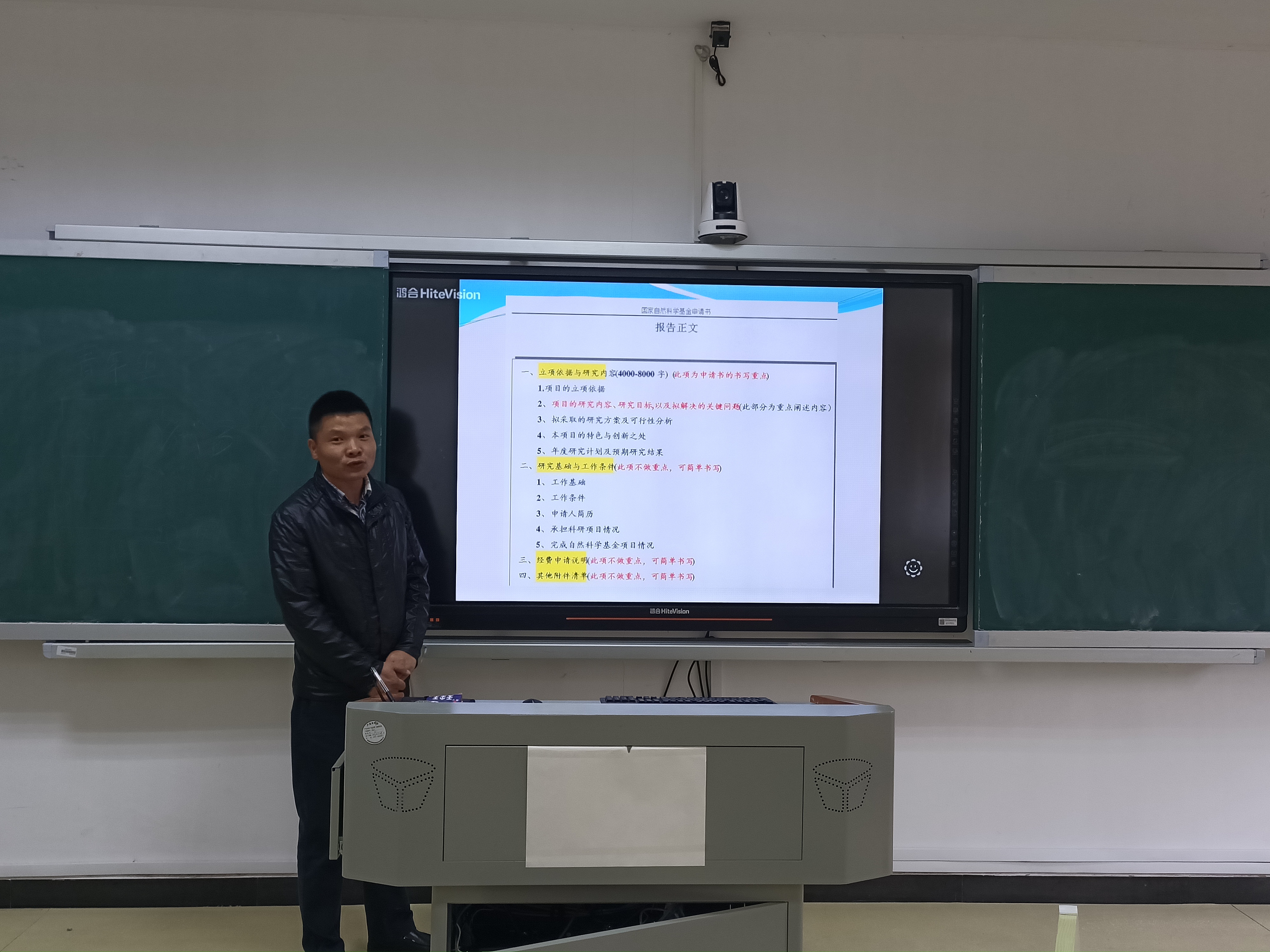 讲座开始,李院长介绍了研究主题,从科研计划书选题与撰写规范并对立项依据与研究内容,研究基础与工作条件,经费申请说明,其他附件清单四大方面做出了主要论述。