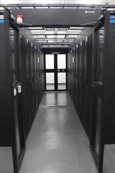 (2)机柜布局及走线。采用华为模块化机房组建数据中心,集成机柜、制冷、配电、管理等子系统,更节能环保;交换中心配置了一组光纤配线柜和两组网络设备柜,分列连体安装,一体化管理;全机房安装开放式桥架进行上走线并分层固定。