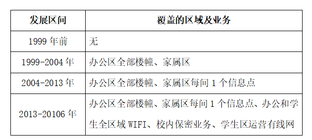 (5)网络覆盖区域发展历程。第三阶段校园网信息点的数量基本上满足学校的需求。