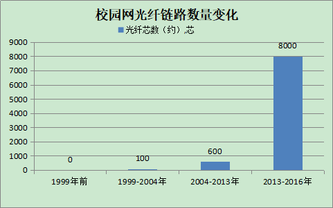 (1)光纤链路发展历程。第一阶段设备间采用双绞线互连,发展过程中部分楼栋新增了光纤进行互联;第二阶段骨干网采用了光纤链路进行数据通信;第三阶段采用结构化布线思想对校内光纤链路进行了重新设计,两级光纤芯数已达8000芯。前期,bat365官网光主干缆数已经基本完成全覆盖,十年内无需再铺设主干光缆。2016年至今新增加了3个接入机房,共增加二级光缆130芯,共计约8130芯。