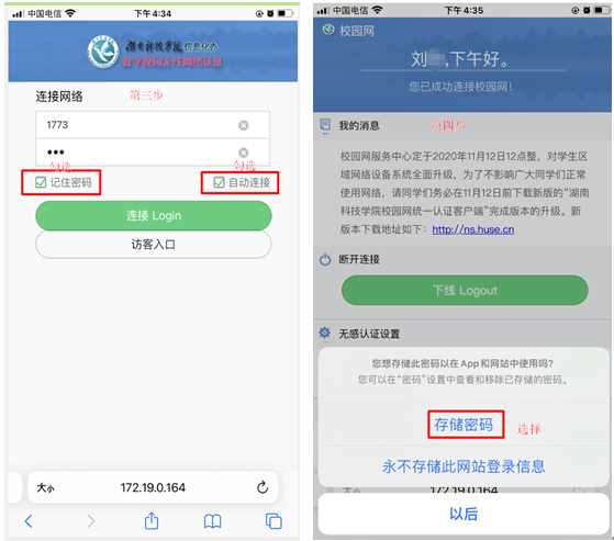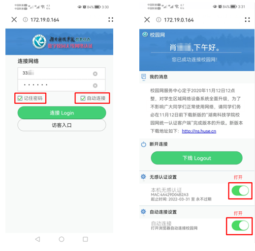 第三步:重新连接校园网wifi进入网络认证界面,输入账号密码,勾选记住密码,自动连接后确认。