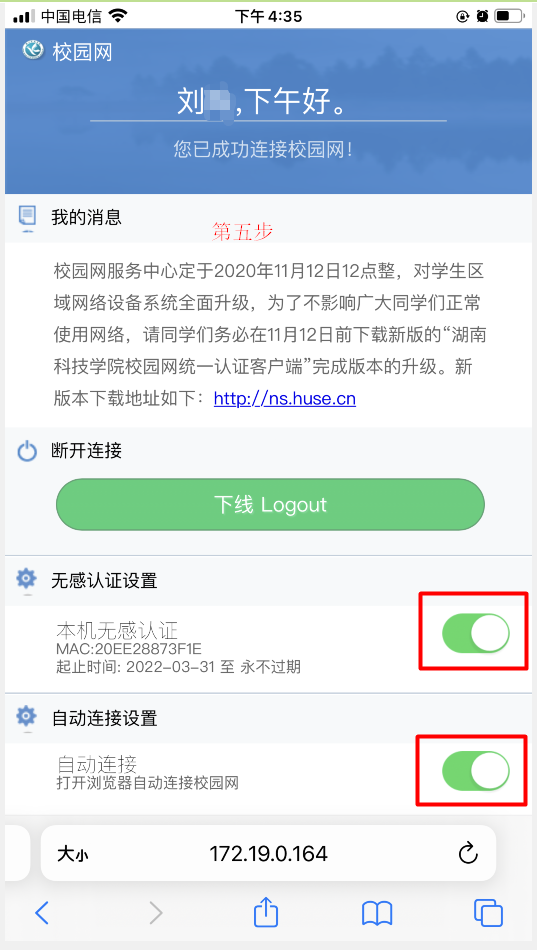 第二步:单击已连接的校园网wifi,出现如下界面,手机MAC地址为随机地址,如红框所示,则进行下一步。