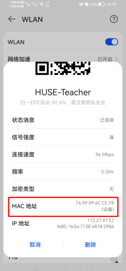 第五步:重新连接wifi,查看MAC地址是否为设备MAC。
