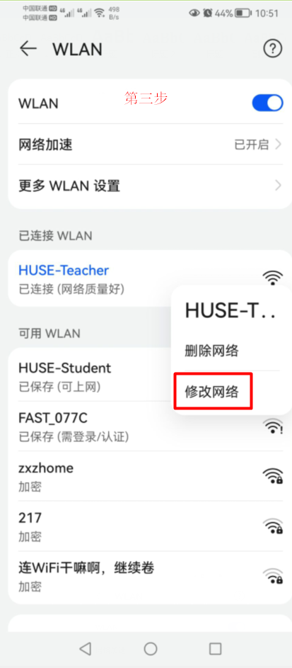 第三步:长按已连接的校园网wifi,选择修改网络,点击下一步。