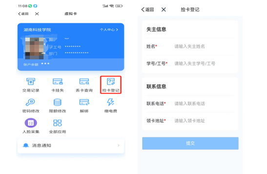 5.点击‘捡卡登记’,可以将您捡到的校园卡,根据卡面的信息进行登记,并留下您的联系信息,方便丢卡人与您联系;