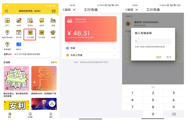 2. 点击“工行充值”,选择或输入充值金额,选择“工行充值渠道”,点击确认支付即可对校园卡进行充值;