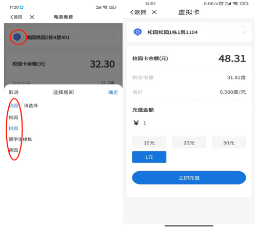 南区、荷园6栋点击南区/荷6电表,其它宿舍区域点击电表缴费,相应区域选择对应需缴费房间进行电表缴费。