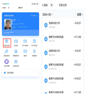 进入app后,首页显示有‘虚拟卡’和‘付款码’,点击‘虚拟卡’则进入到校园卡全局页面。