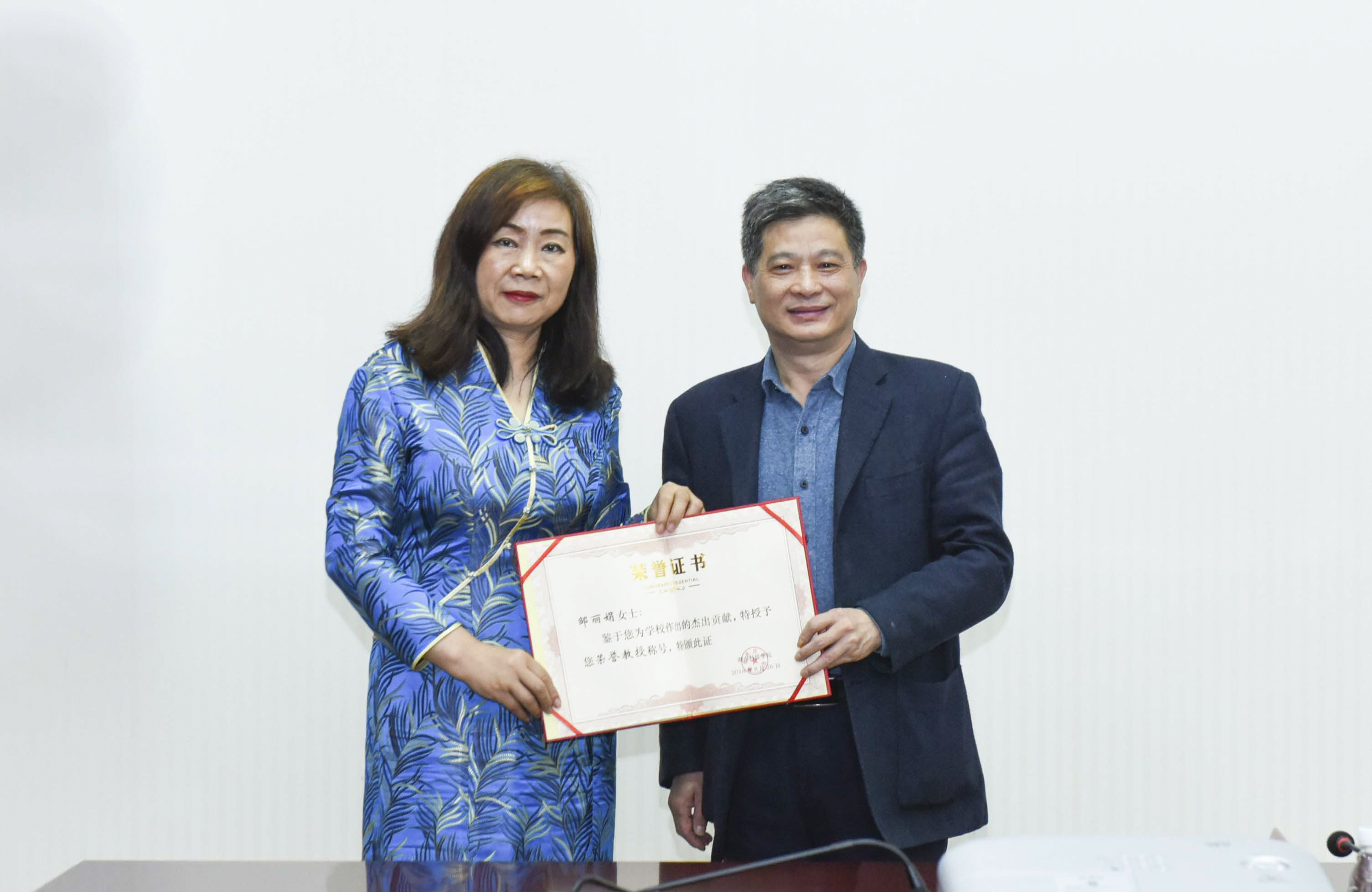 唐艳明为邹丽娟校友颁发了荣誉教授证书。