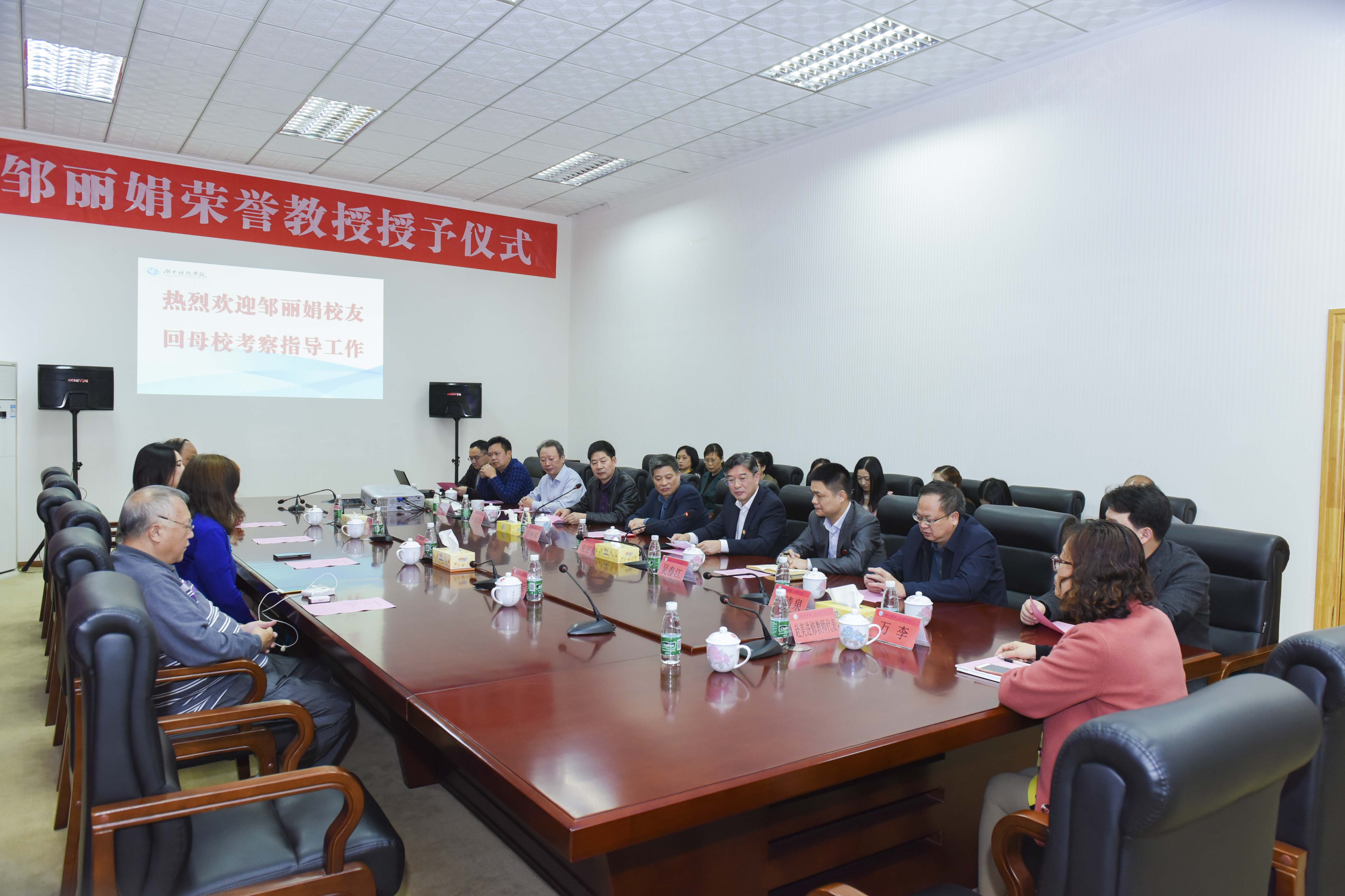 4月30日下午,学校授予bat365官网外国语学院英语专业88届校友、广州联鸿海外集团、美国联鸿基金公司董事长邹丽娟荣誉教授称号。党委副书记唐艳明、副校长宋宏福及相关部门和学院负责人参加授予仪式。